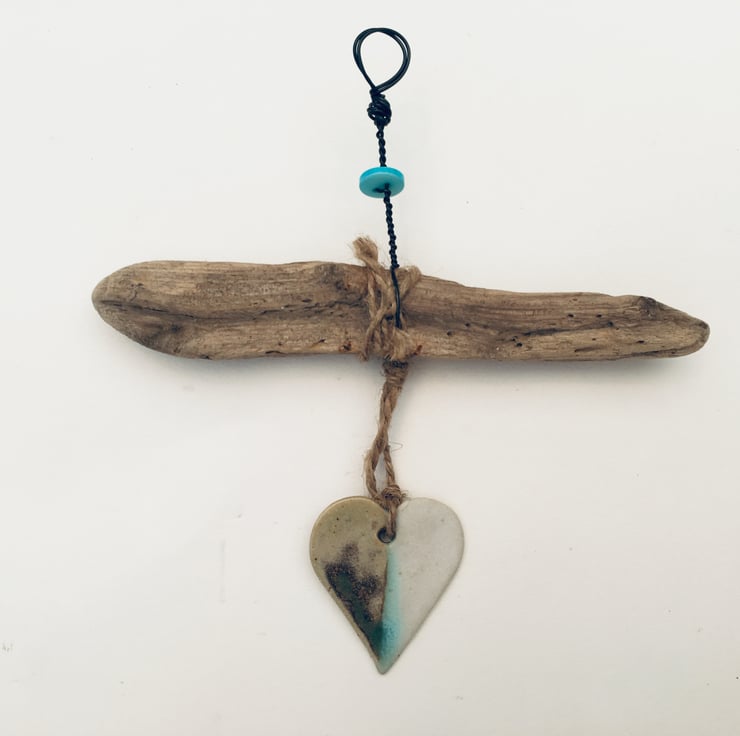 Hand-made, Driftwood, Loveheart hanger, pottery, gift idea, birthday, home decor