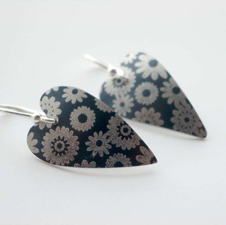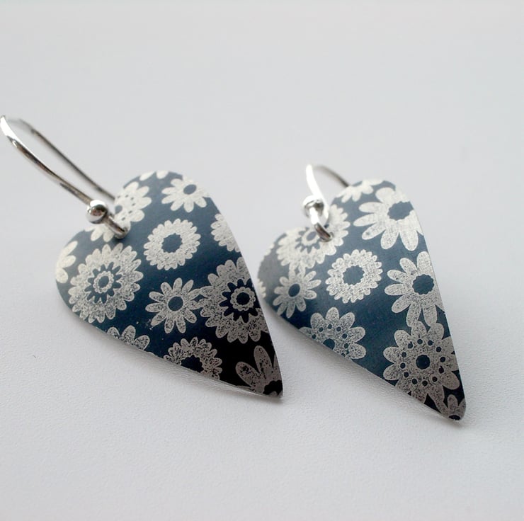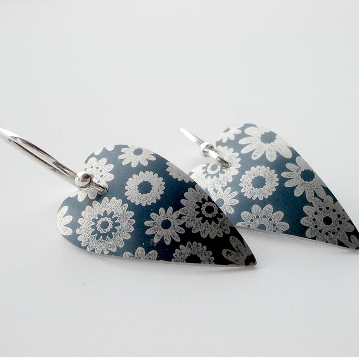 These sweet little charcoal black coloured heart earrings are hand made from aluminium which I have dyed in a charcoal black colour adding silver flower prints. I then seal the dye so that it becomes a permanent part of the metal. I cut out the heart shapes by hand, using a piercing saw, then dome them so that they catch the light.