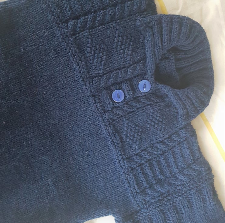 The pattern starts just under the arms and is the same on the front and the back. It has an open neck which fastens with two buttons which are the same colour. This makes it easy to get off and on over the head. It also has a collar which looks good folded down as in the photos or up to keep the neck warm.