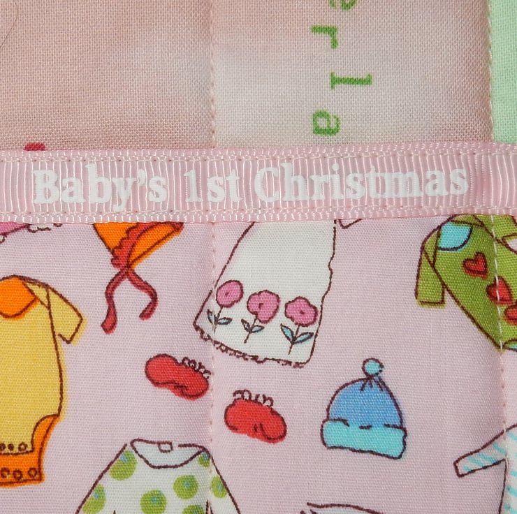 This baby bib is made from two cotton fabrics, one featuring items of baby clothing, and the other a modern Christmas print. The bib has a cotton mix wadding, and a flanelette backing for softness and absorbency and is fully washable. There is a ribbon reading "Baby's 1st Christmas". It has a velcro fastening, and is bound in a pink binding.