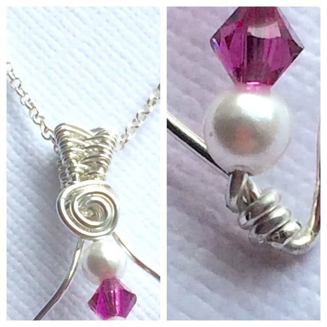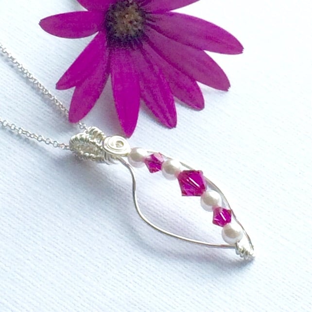 I have formed sterling silver wire into a three dimensional curved leaf shape and added beautiful Swarovski pearls and fuchsia pink crystal beads with a lovely sparkle.