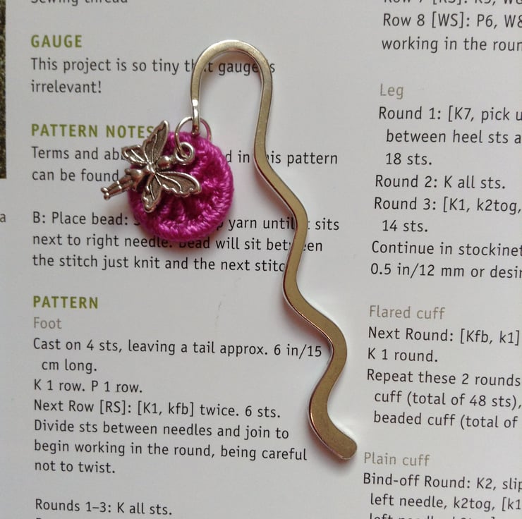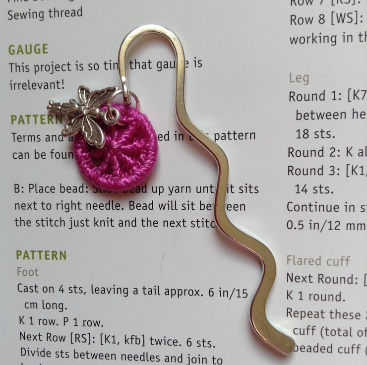 Wavy Shepherds Crook bookmark with a Dorset button which I have made in Cerise perle yarn on an 18mm brass ring, together with a sweet fairy charm in Tibetan silver.