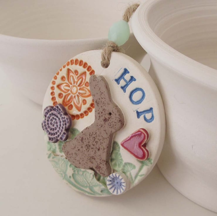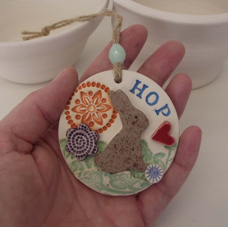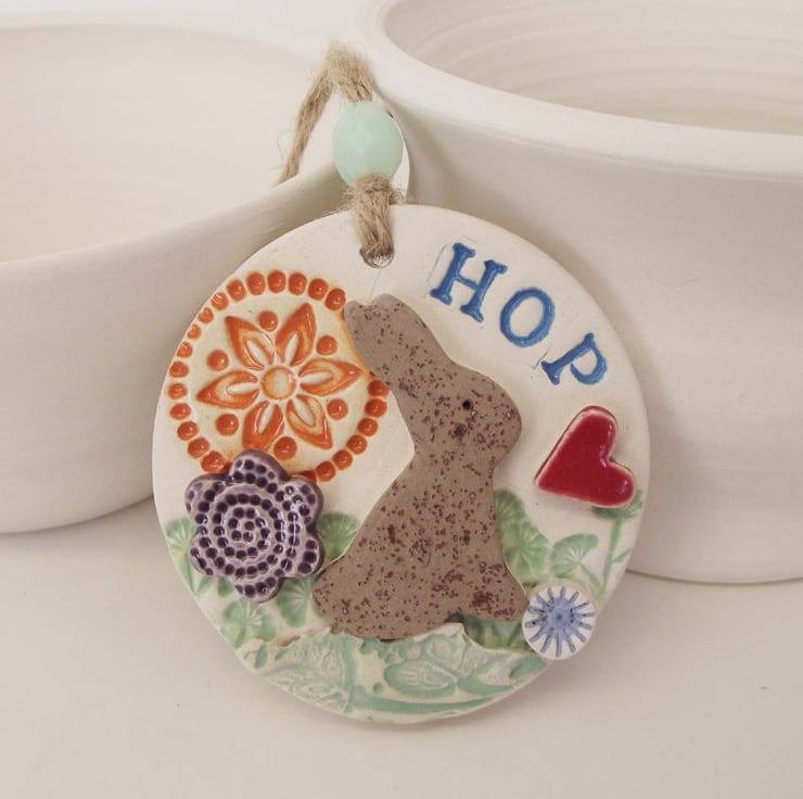 This cute little hanging decoration has been made from white earthenware clay where it has been decorated with colour and then fired twice.