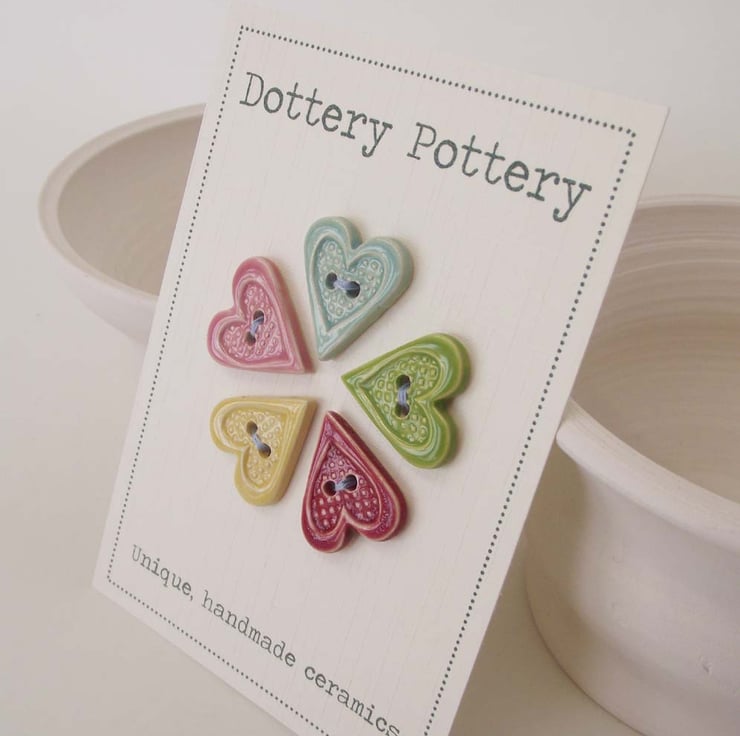 This set of five buttons are made from white earthenware clay, embossed and glazed to 1100 degrees, so nice and strong.