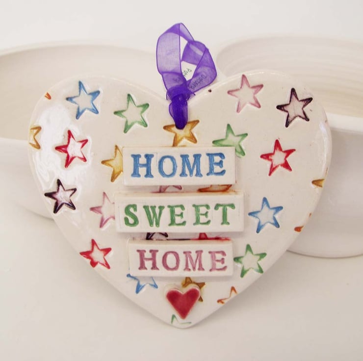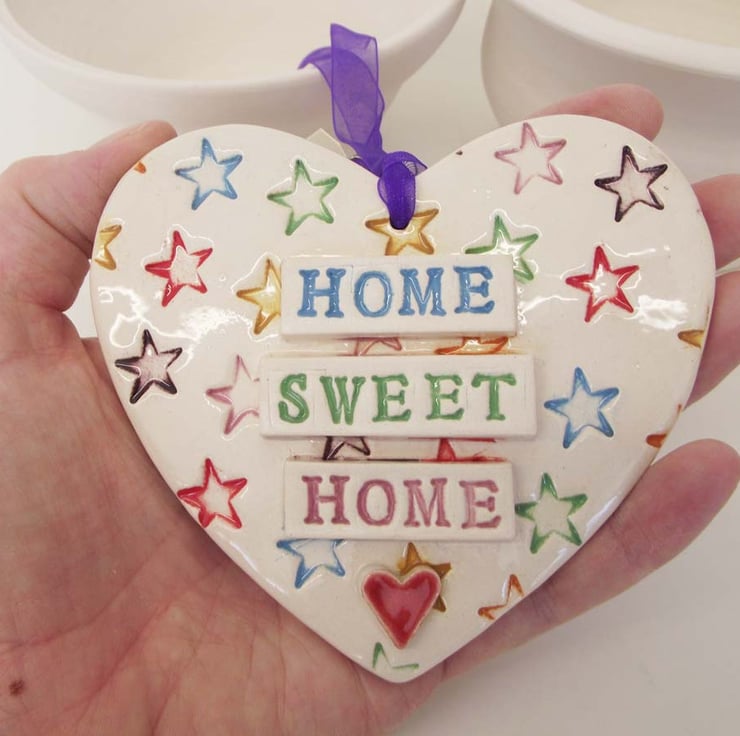 This ceramic heart is made from white earthenware clay and decorated with the words, Home Sweet Home.