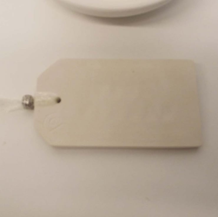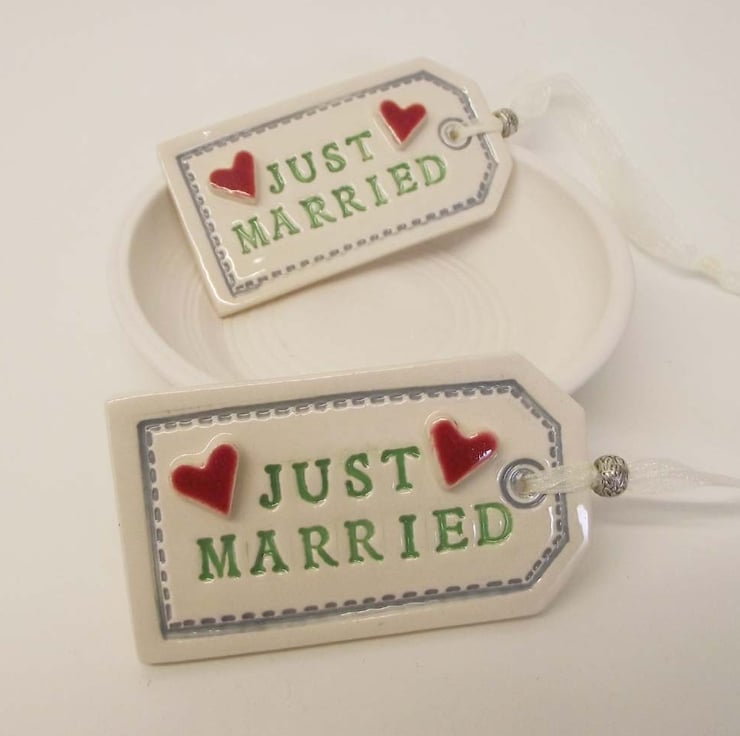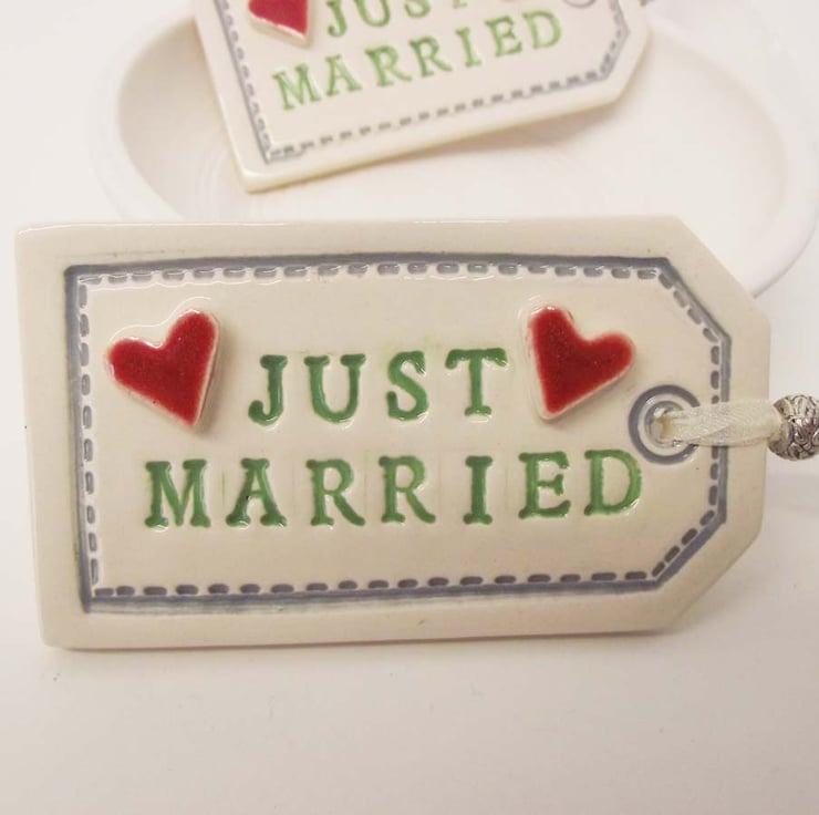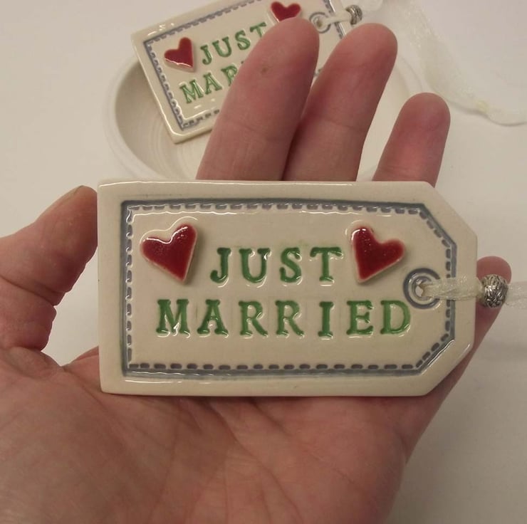 This tag decoration is made from white earthenware clay and is finished with the words "Just Married"