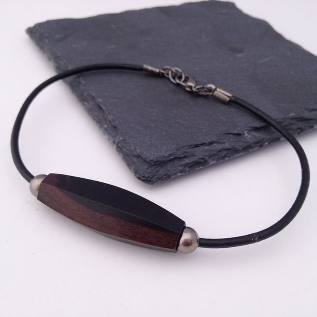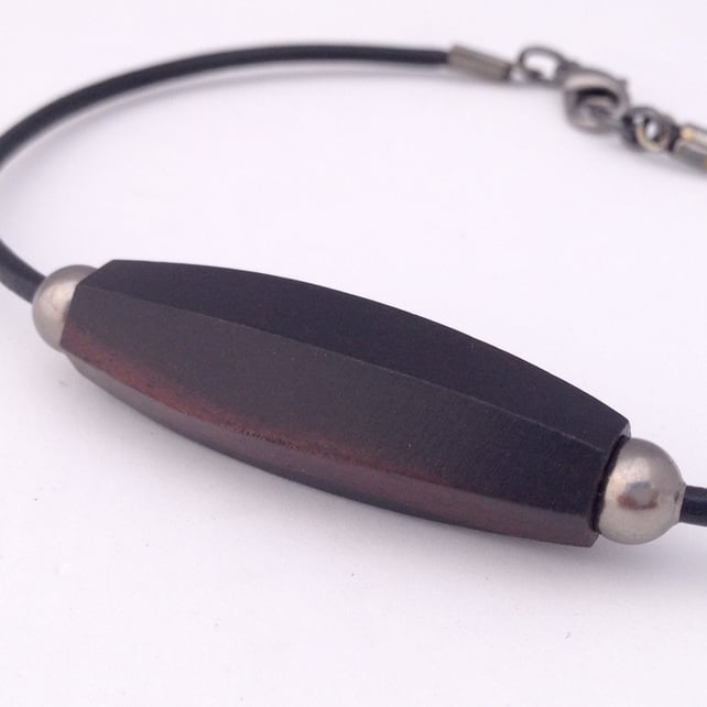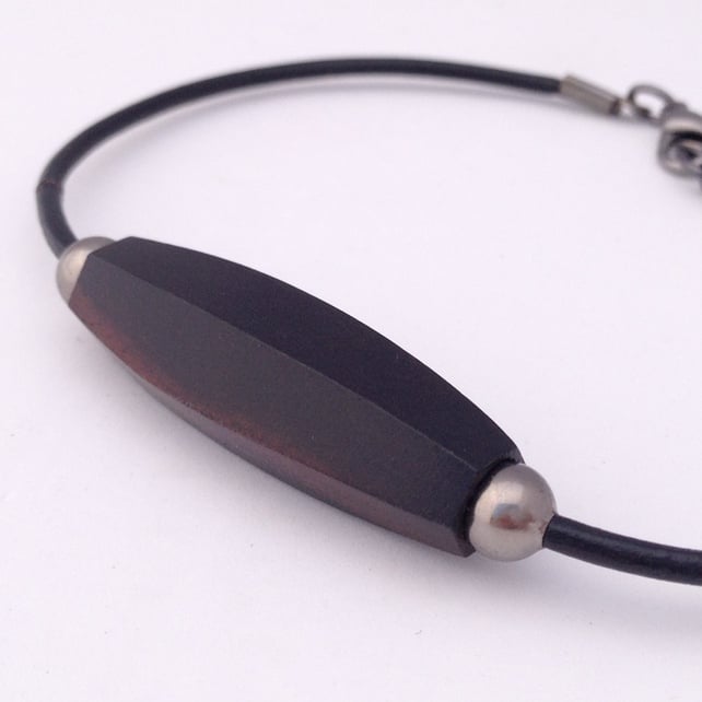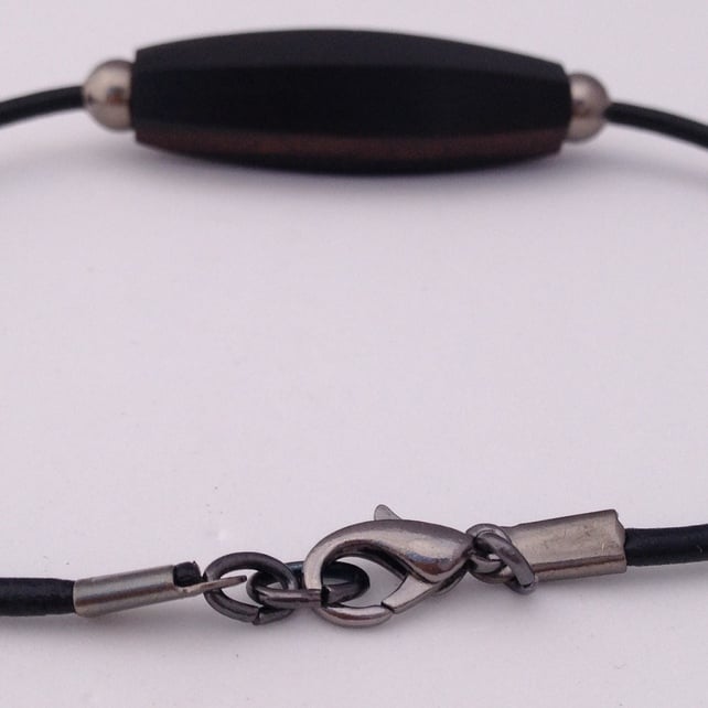 A rich Tiger Ebony Wood six sided oval bead (approx. 35x12mm) sits at the centre of this bracelet. Either side of the wood bead is a 6mm gunmetal coloured spacer bead to highlight the central bead. All have been threaded onto black leather cord.