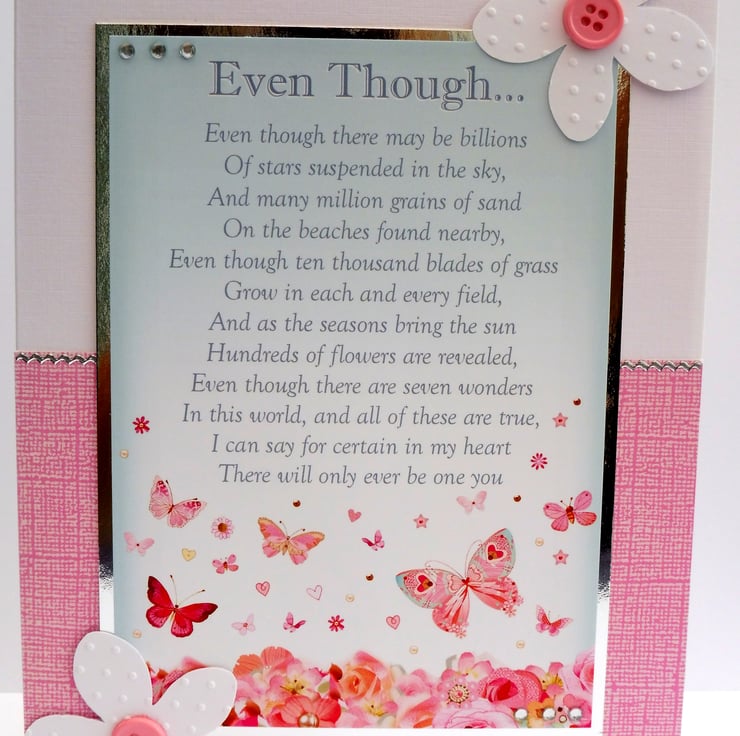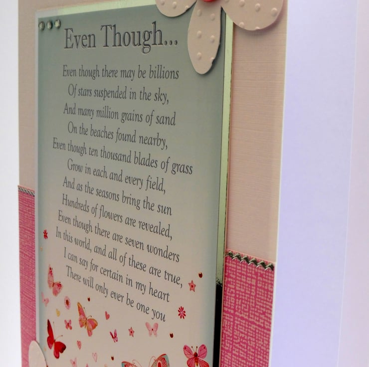 SENTIMENT: There is no sentiment just a verse which reads "Even though there may be billions of stars suspended in the sky, and many million grains of sand on the beaches found nearby, Even though ten thousand blades of grass grow in each and every field, and as the seasons bring the sun hundreds of flowers are revealed, even though there are seven wonders in this world and all of these are true, I can say for certain in my heart there will only ever be one you."
