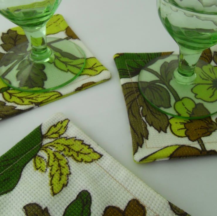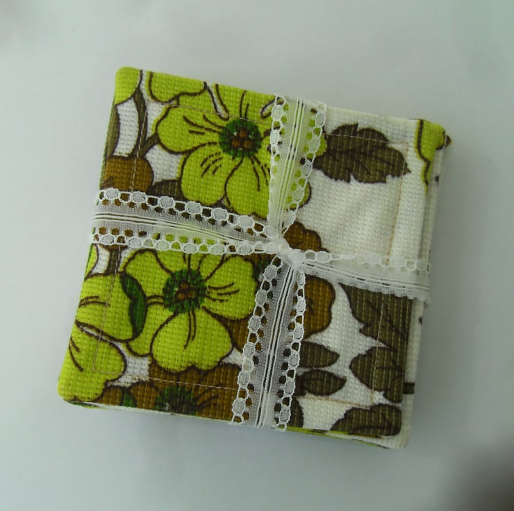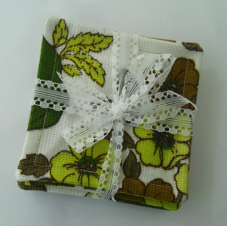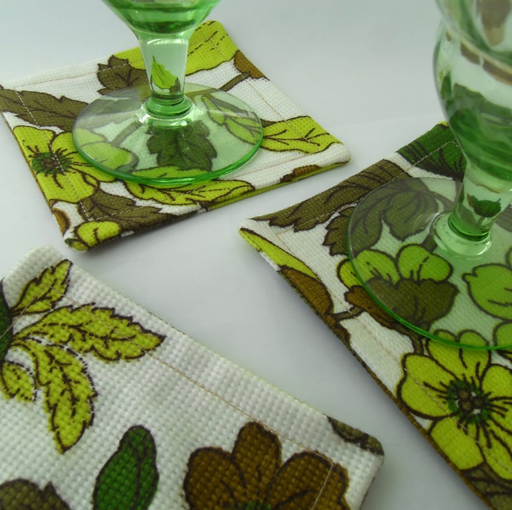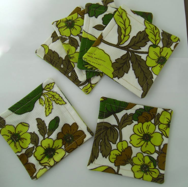 A set of 6 coasters made with genuine vintage stitch-bonded fabric in a funky floral print.