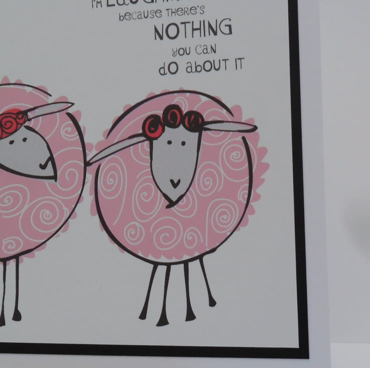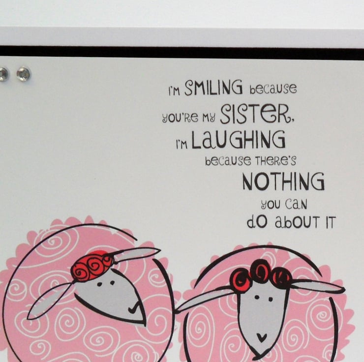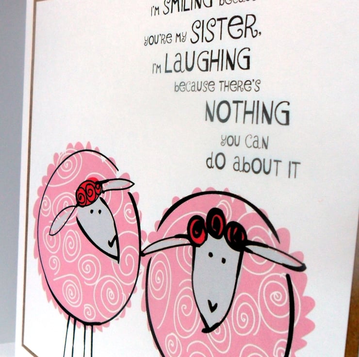 SENTIMENT: There is a caption on the front which reads "I'm smiling because you're my sister. I'm laughing because there's nothing you can do about it."