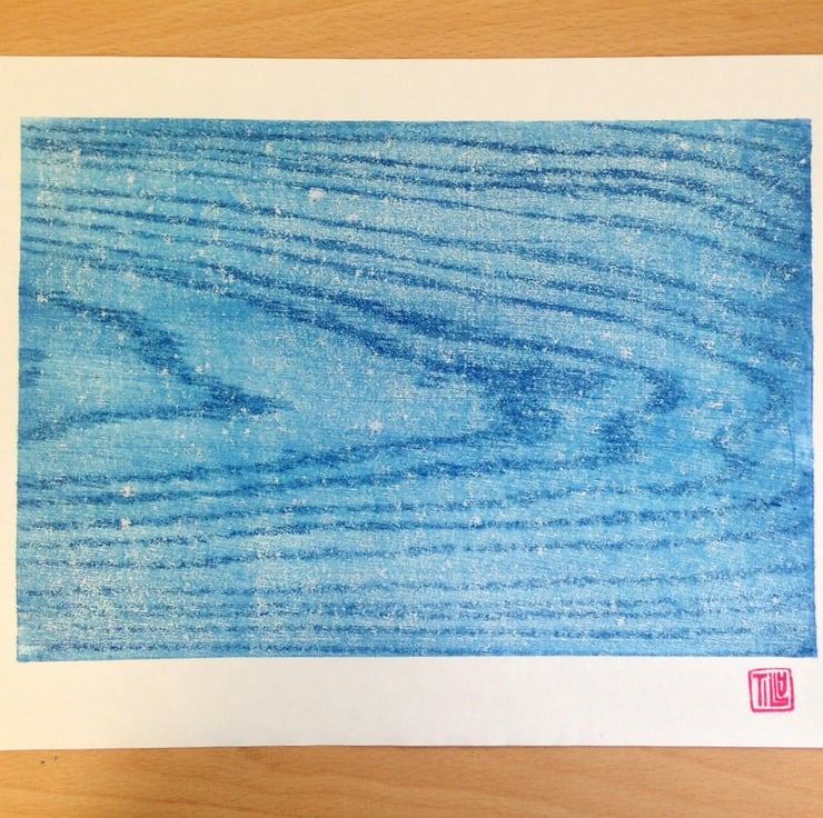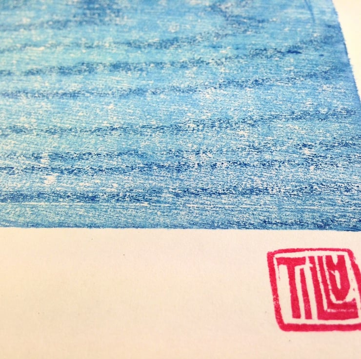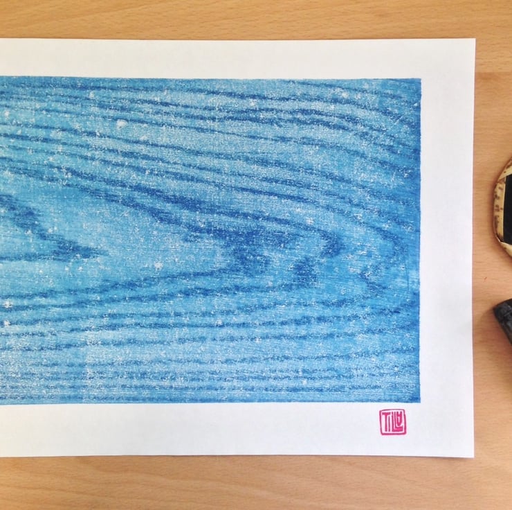 'Water' woodcut, woodblock print, printmaking, prussian blue, wood grain