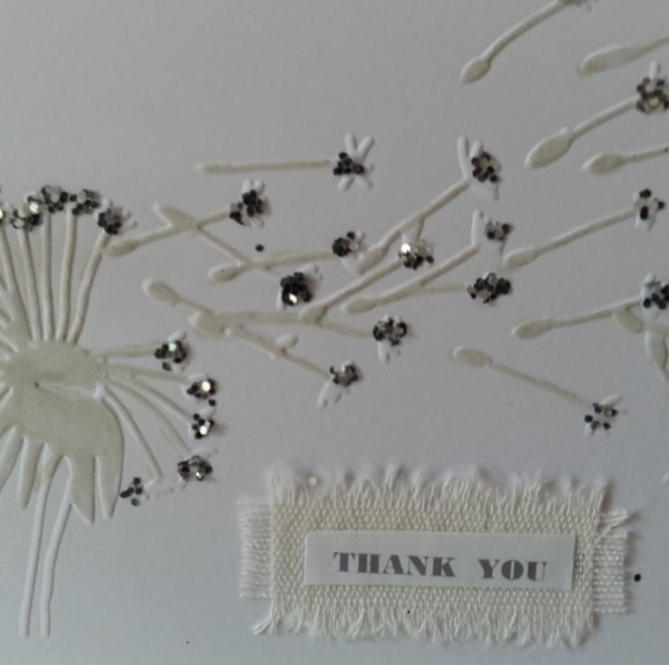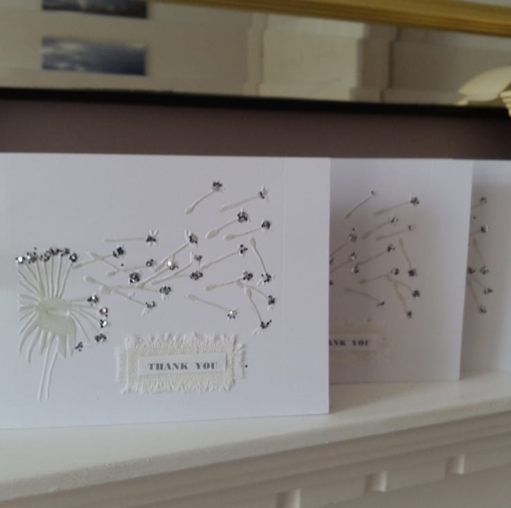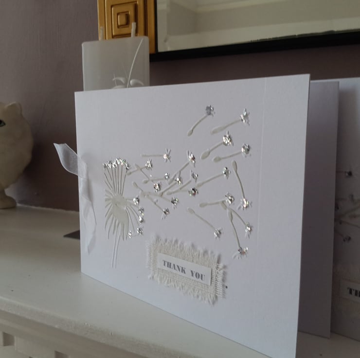 A completely handmade and uniquely designed pack of 4 identical cards. Consisting of quality pristine white card which has been embossed with a design of a dandelion seed head blowing in the breeze. They have been hand coloured in pale grey and the seed beads highlights with silver glitter. A linen rectangle with thank you printed onto paper. Finished off with a white organza ribbon bow.