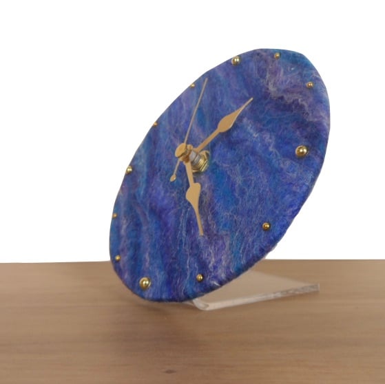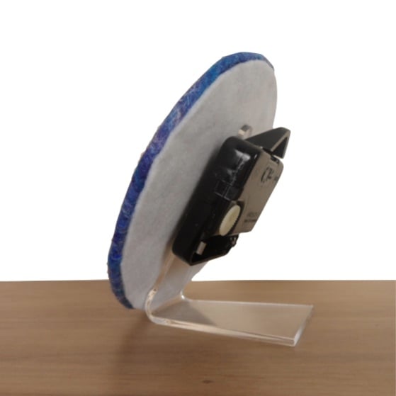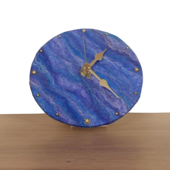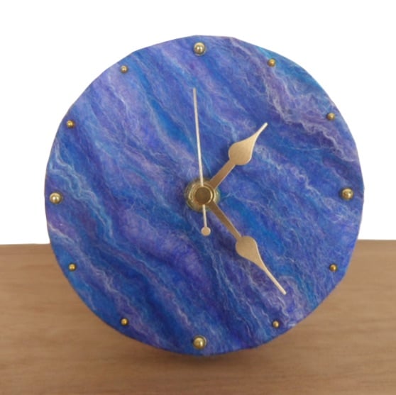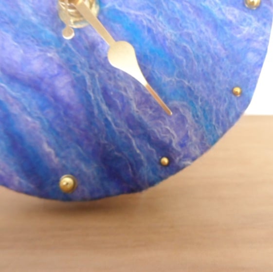 This clock face has been made by mounting a piece of nuno felt onto a plywood base. The nuno felt has been made by laying a very fine layer of merino wool in shades of blue over a silk chiffon fabric. This is then worked with soap, water and elbow grease to force the woollen fibres to migrate through the silk and bind with it. The result is a lovely light fabric with a marbled effect.