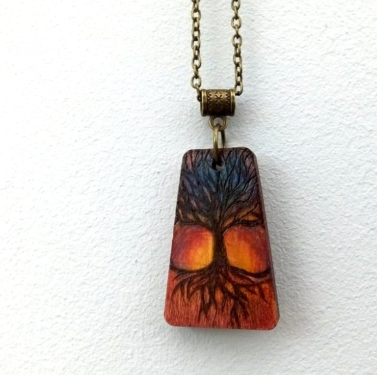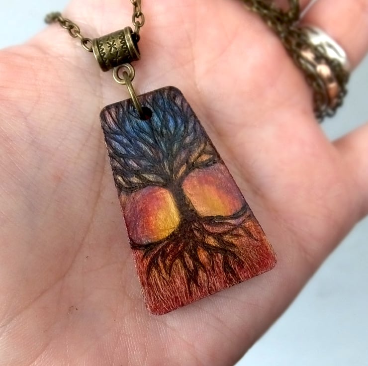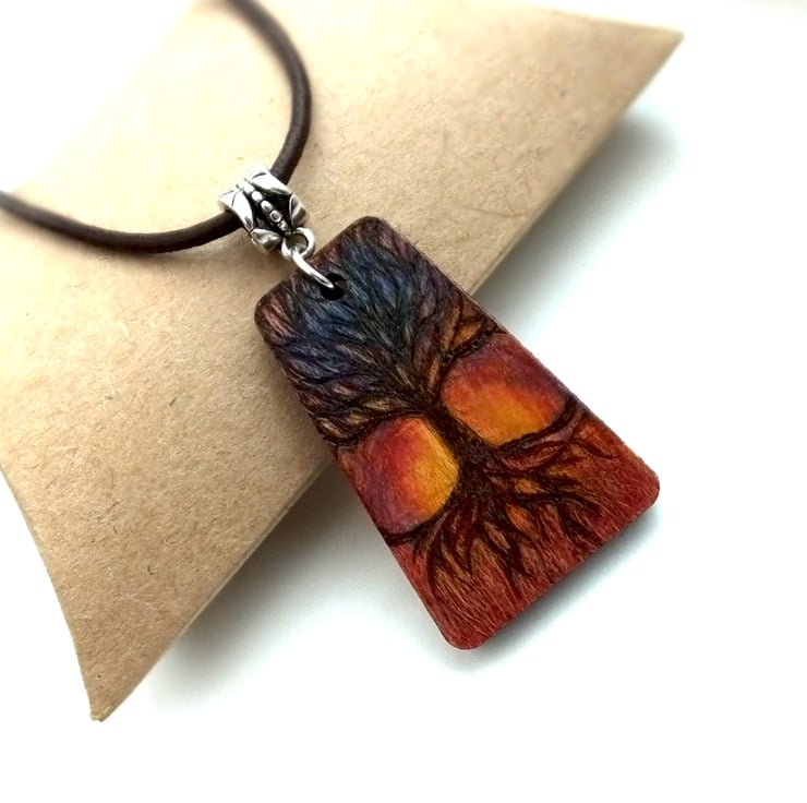 This listing is for a beautiful wooden Tree of Life Pendant, silhouetted against a warm sunset, created using pyrography, prismacolor pencils and posca paint marker. The wood is maple and the pendant is varnished to protect the design.