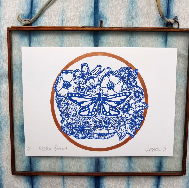 This listing is for a limited edition original lino print of my design "Moth on Blossom". This is a limited edition of just 15 prints. This design has an addition of a hand painted copper ring to 'frame' the print of the moth on flowers.