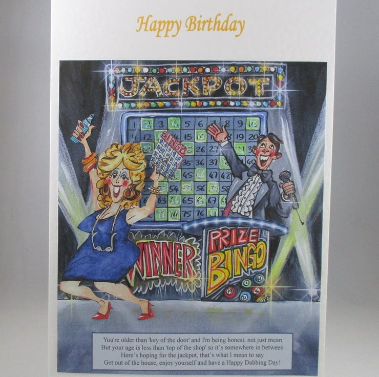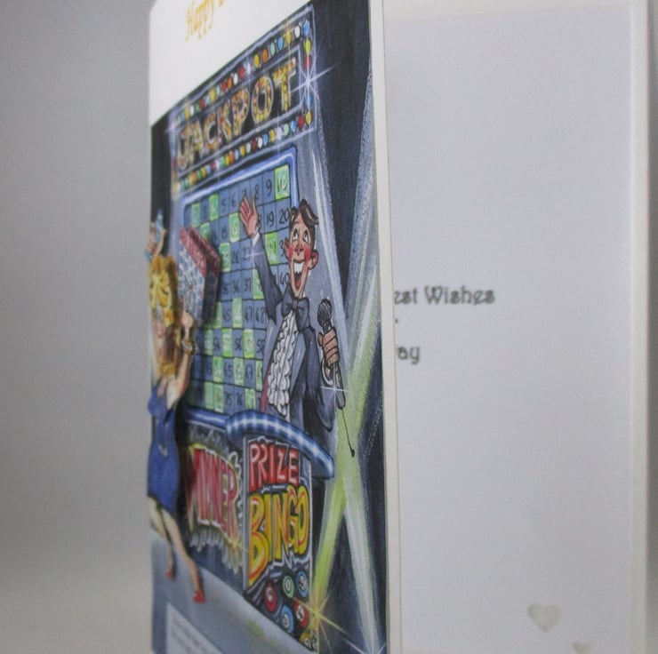 A white card measuring 150x210mm (6x8in) features a lady having a win at the bingo! It is slightly 3d.