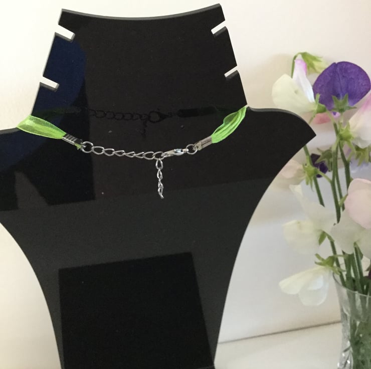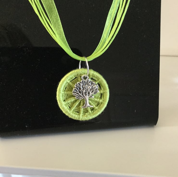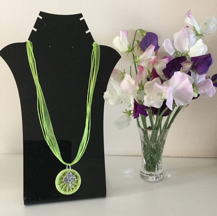 It is hanging together with a Tibetan silver 'Tree of Life' charm from a multi waxed cord and organza ribbon necklace in green which fastens with a lobster claw catch.