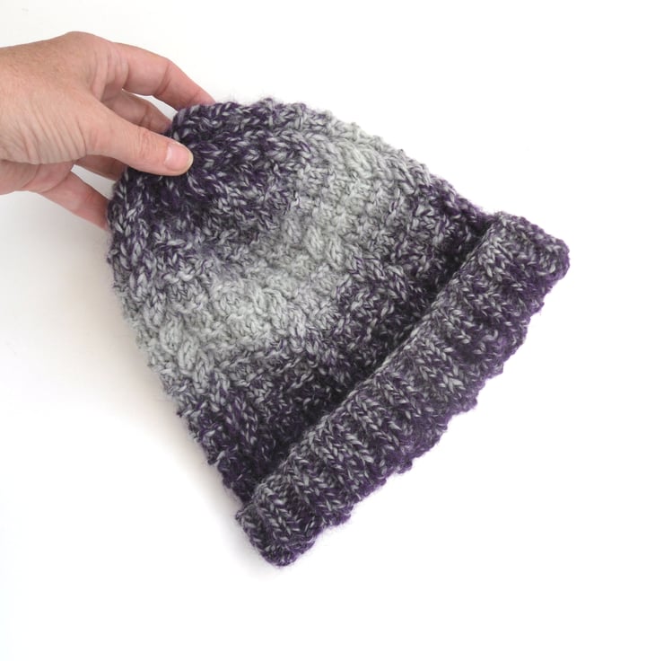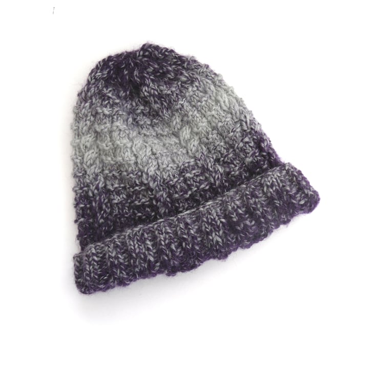 Knit in a multi coloured fashion yarn , ranging from deep purple to light blue/grey in 78% acrylic with 22% wool. It fits an average adult head , 20" in circumference and has a 2" turn up ribbed brim. The hat itself is knit in a textual cable pattern , lovely to feel. To say this hat is knit in a predominately acrylic yarn it's really super soft to the touch.