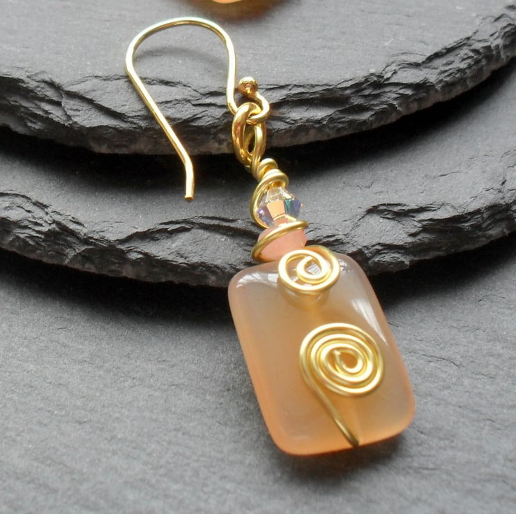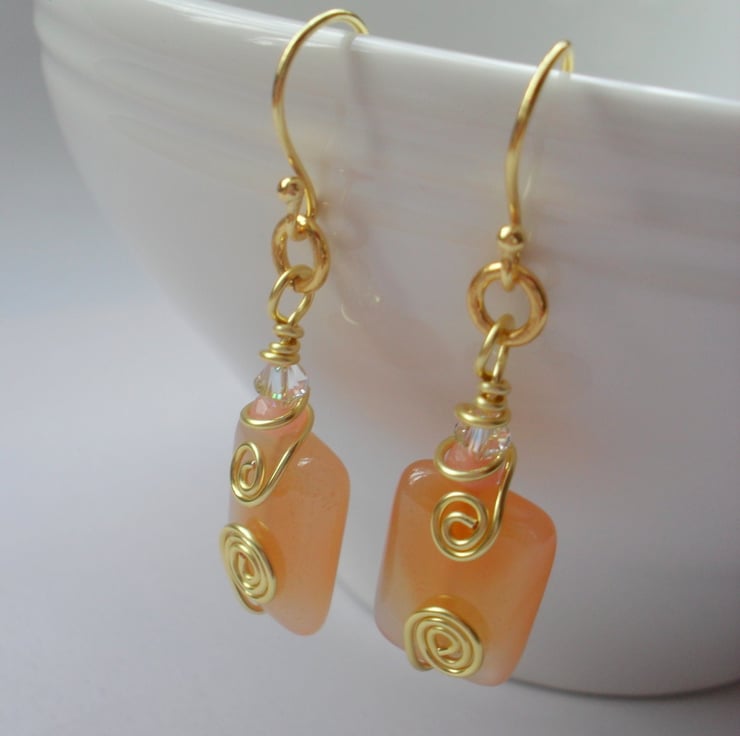 Light orange agate,peach quartzite semi precious gemstones with aurora borealis swarovski crystals which give the earrings a little sparkle have been wire wrapped with gold colour plated copper wire which are then attached to a gold plated copper ear wires