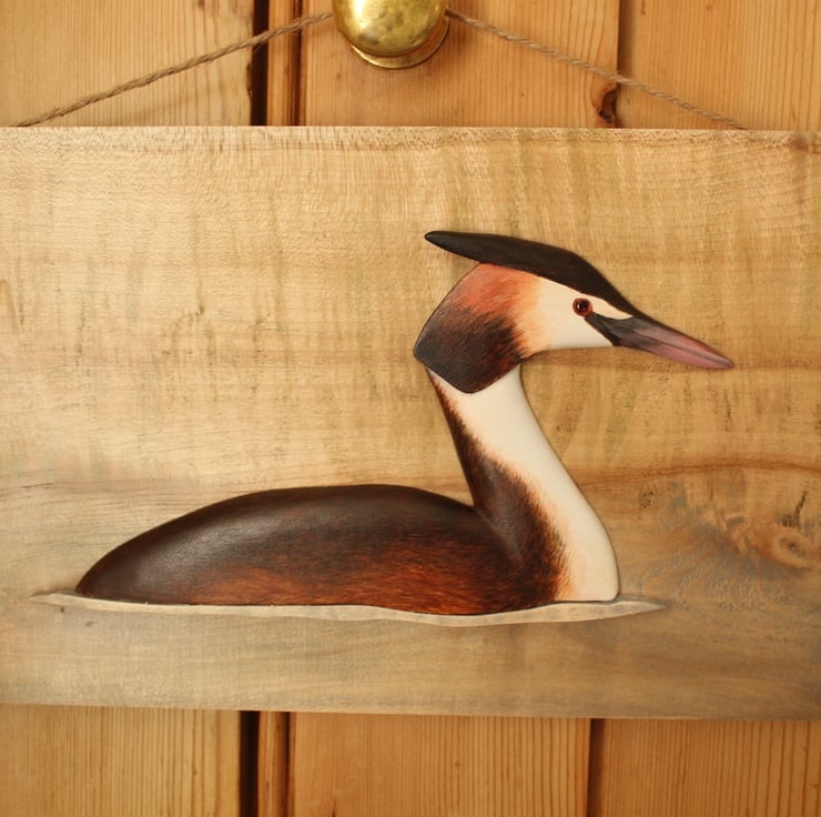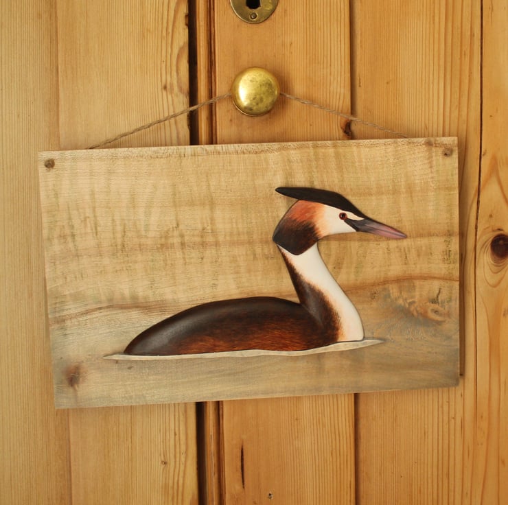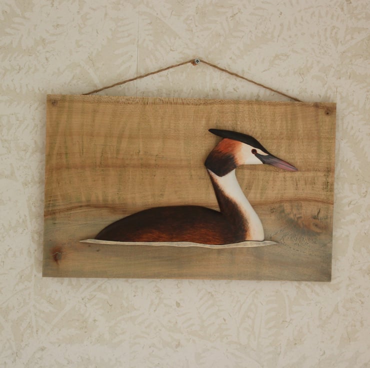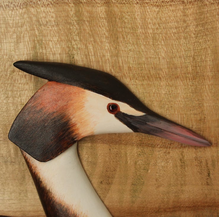 Hand carved from lime and painted with acrylics, this great crested grebe is mounted on a spalted maple panel. The panel has been subtly colour washed to take advantage of the wood's natural markings. The bird has a painted glass eye and the whole piece has been waxed giving it a soft shine. The panel is 27cm by 17cm and has a twine hanging cord.