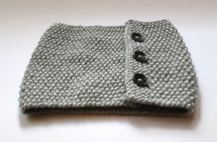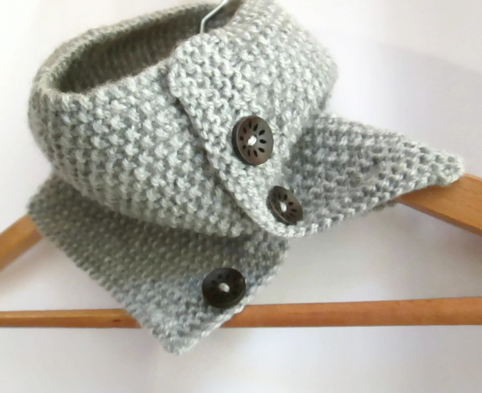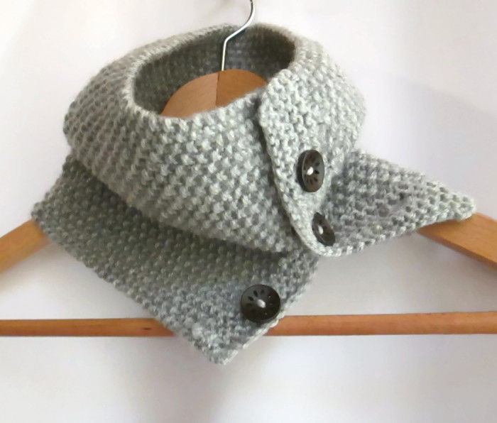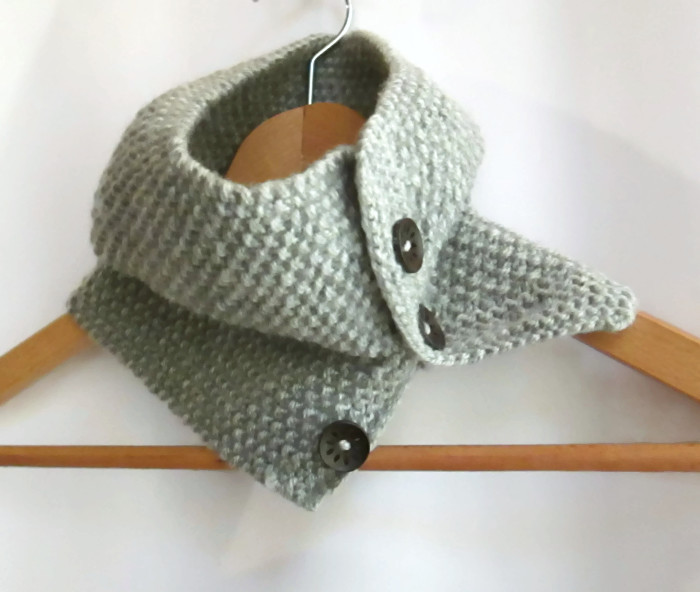 This ladies Aran wool cowl neck warmer is great for keeping that winter and Spring chill off. It's made in a lovely soft grey Aran wool (25% wool) and fastens with 3 chocolate brown wooden buttons. It's hand knitted in a moss stitch pattern.