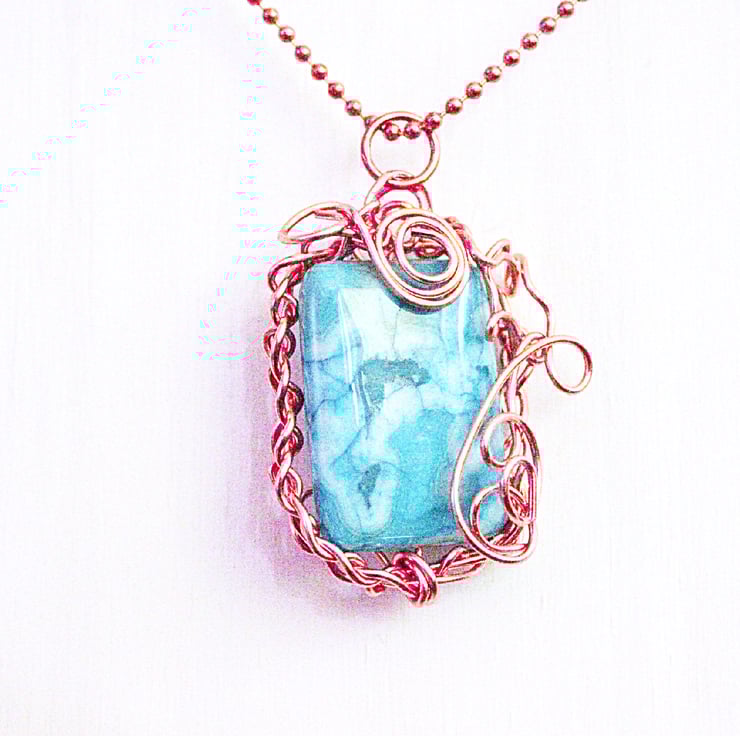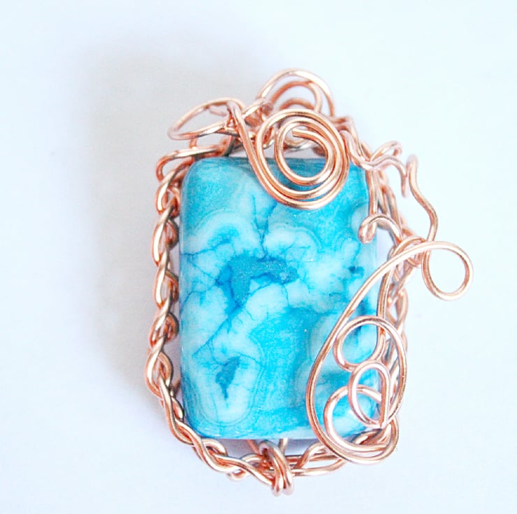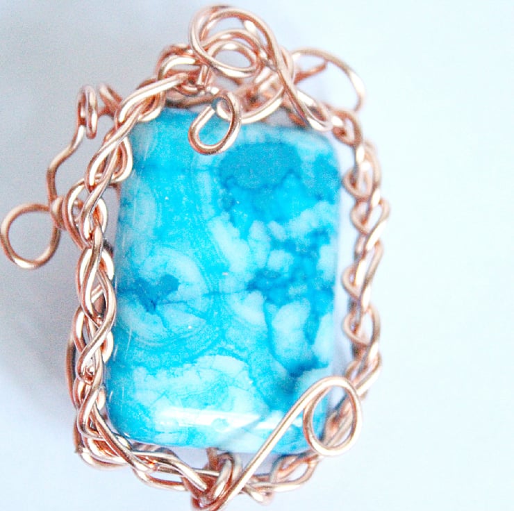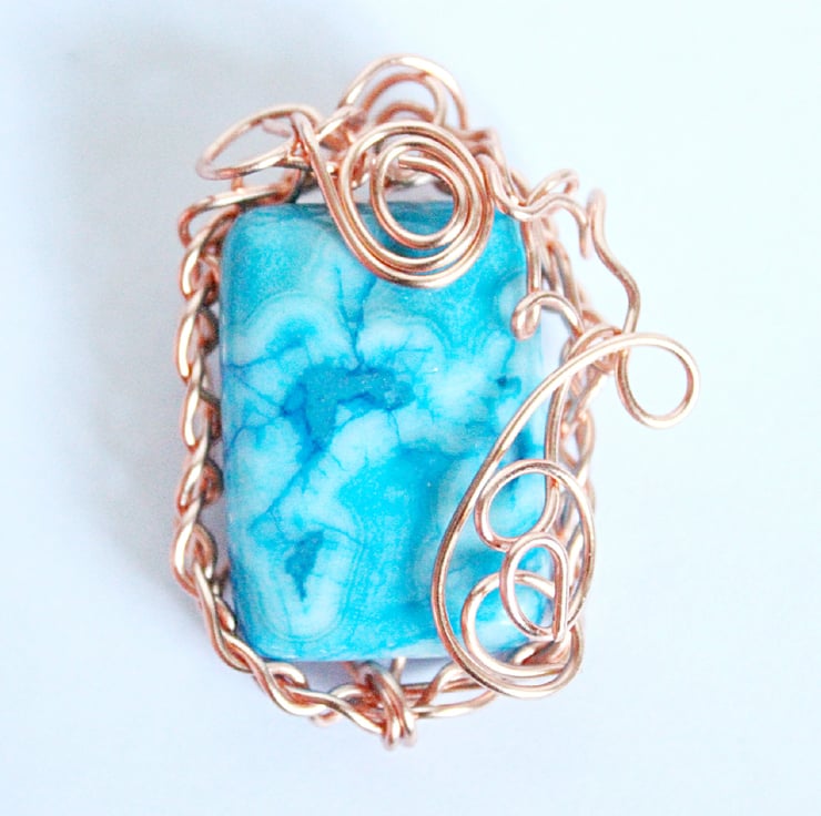 This unusual pendant was made by weaving strands of non-tarnish copper wire together to create a frame. The frame was fitted around a bead of blue crazy lace agate, and then looped and coiled a bit more for good measure!