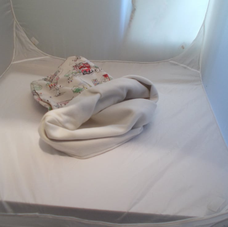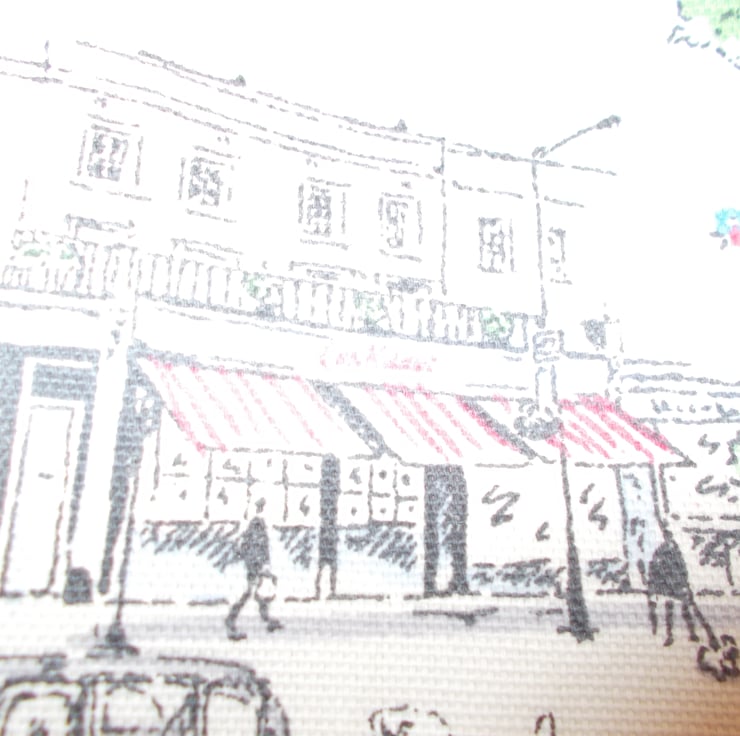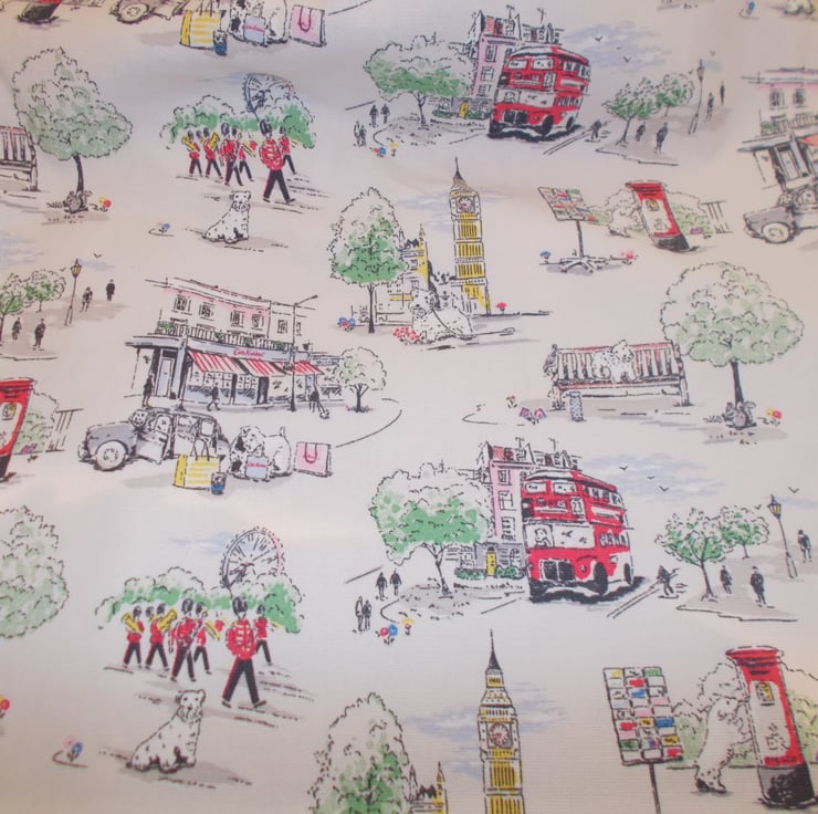 The background fabric is white with various scenes of london and the shop of the designer and her dog printed on it in various colours.