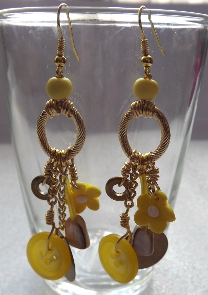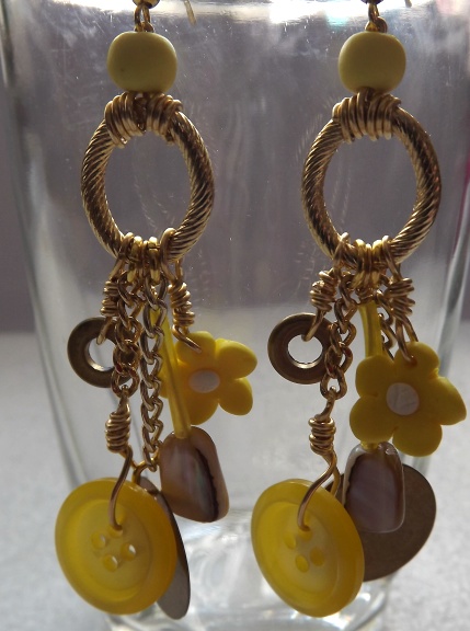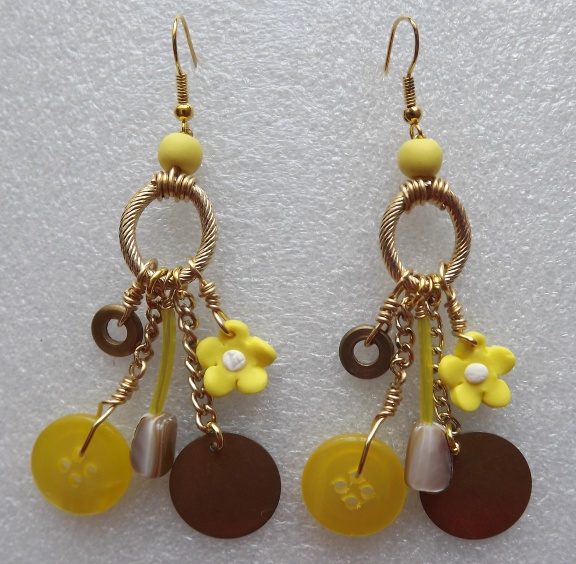 For these earrings I have made 5 dangles consisting of a polymer clay flower, metal disc, shell bead, a button and a small washer all attached to a large fancy chain link with a clay bead on top. They are on gold plated hooks.