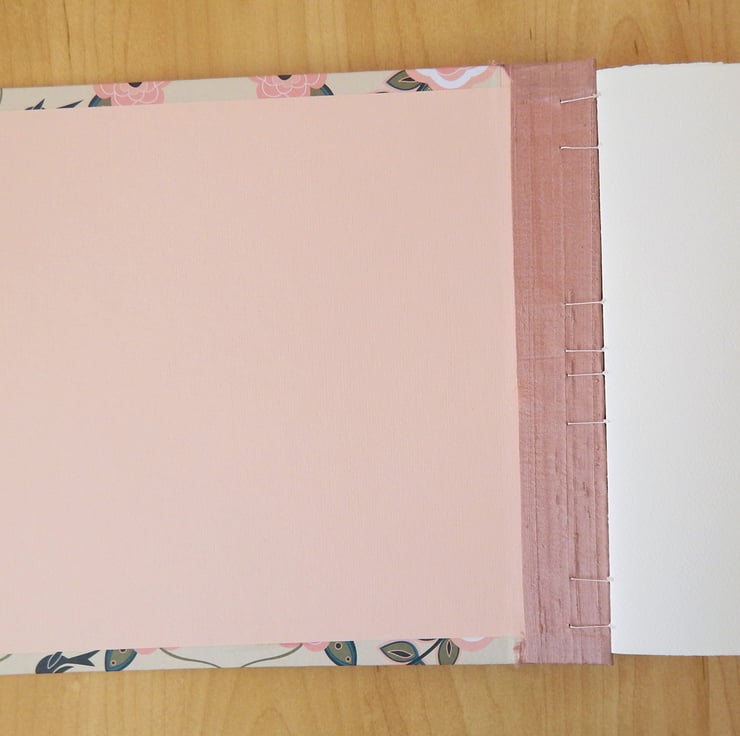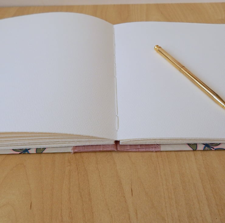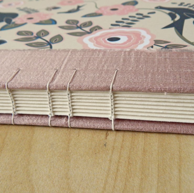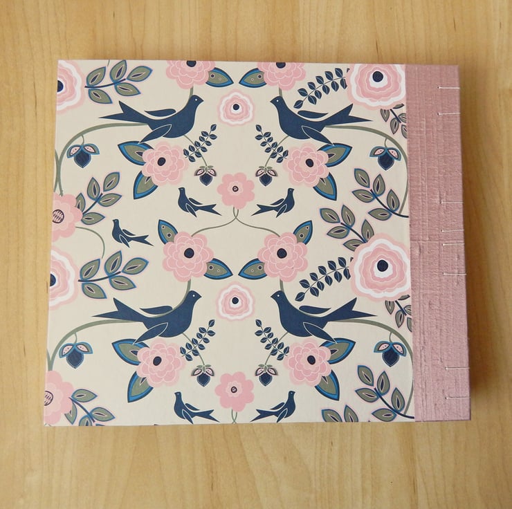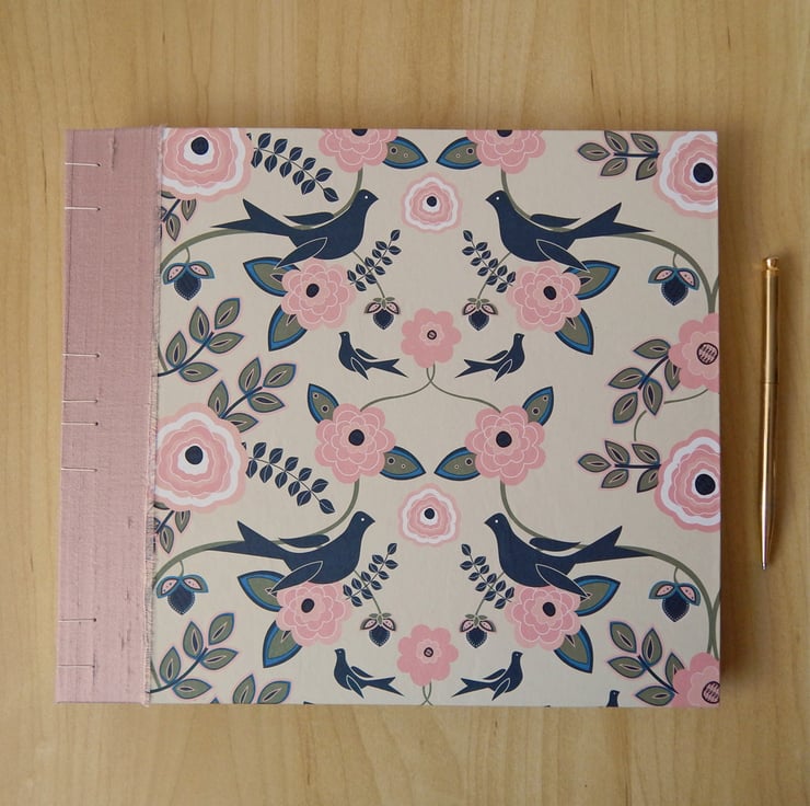 A wedding guest book, or photo album, hand made with beautiful bird and flowers paper covers and blush pink silk trim.