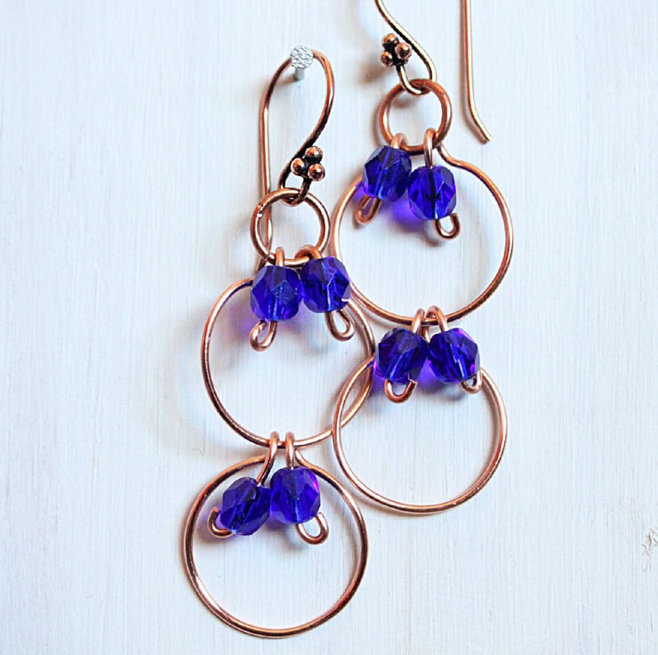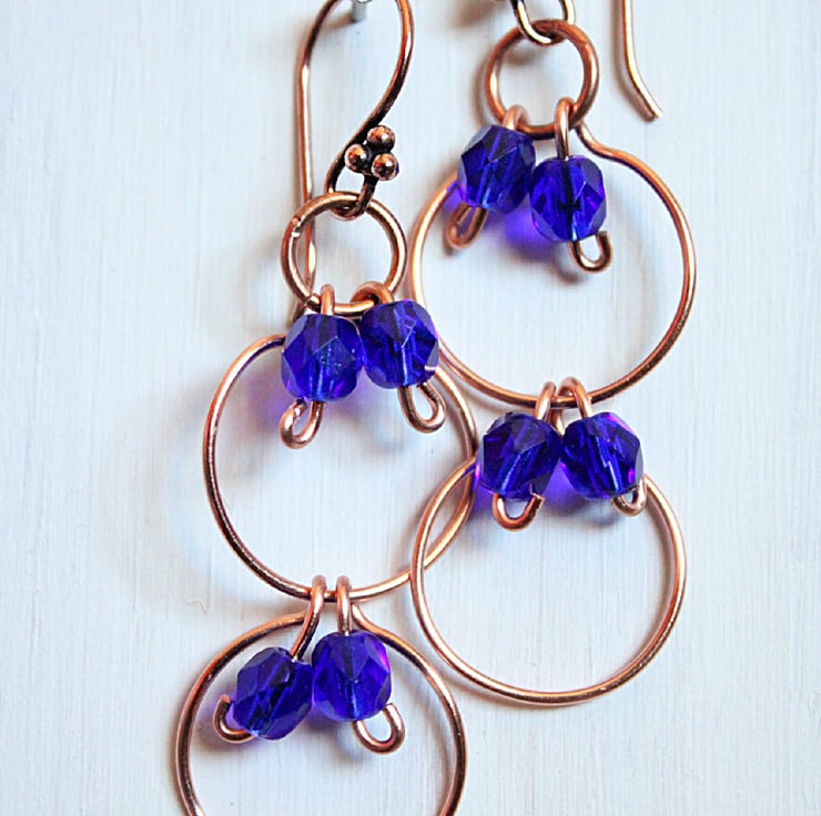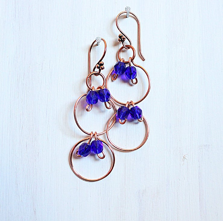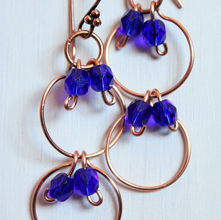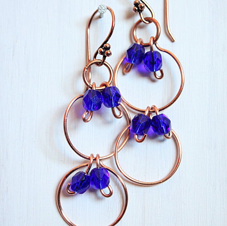These earrings are made from beaded circles of copper, adorned with dark blue beads and linked together in pairs.