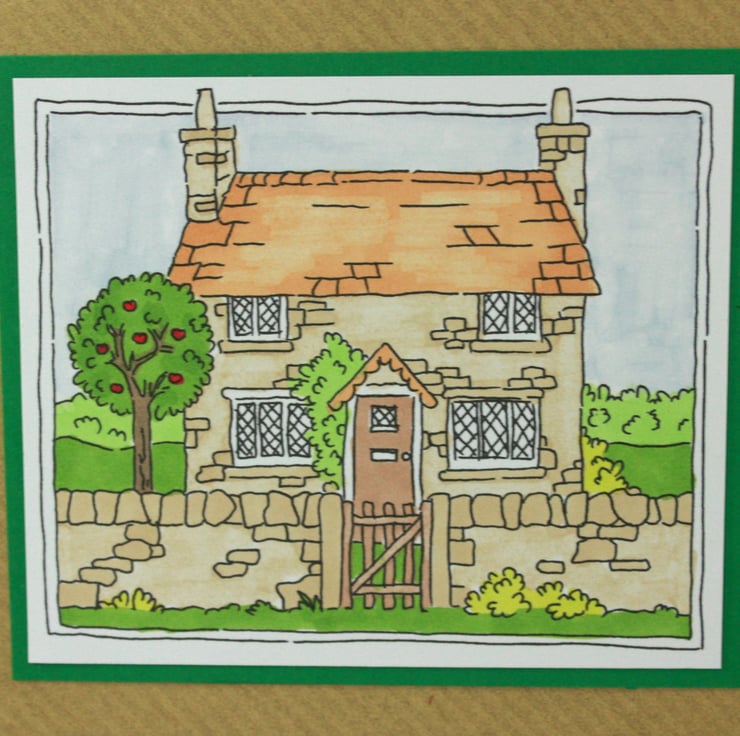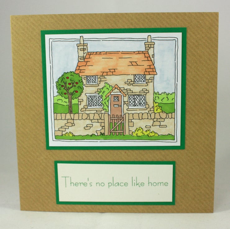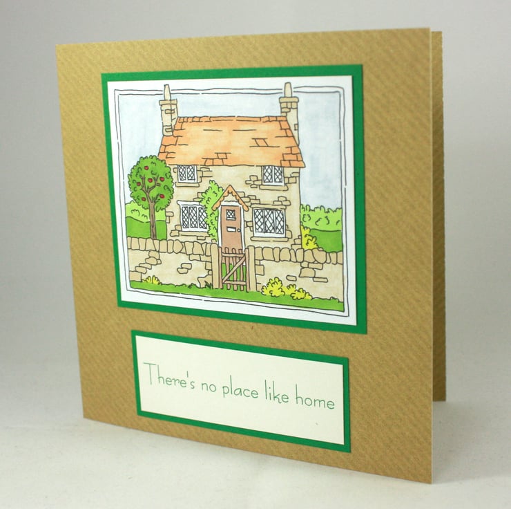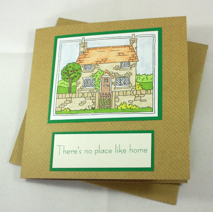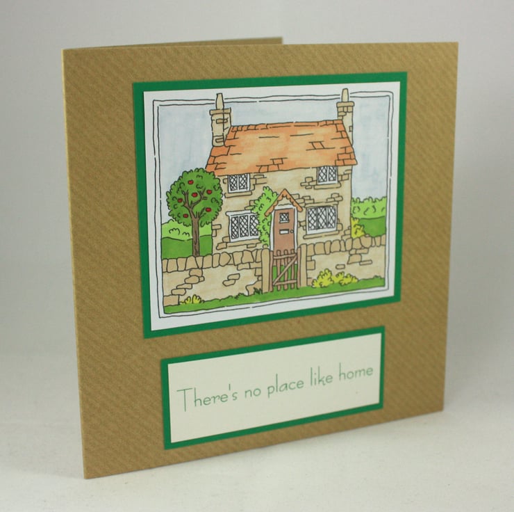 Square, kraft, new home card featuring a coloured image of a country cottage, with the message 'There's no place like home'. Both the image and message have been mounted on green card. The insert has been left blank for your own personal message.