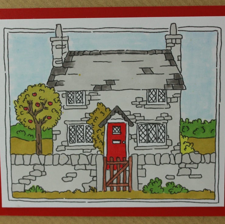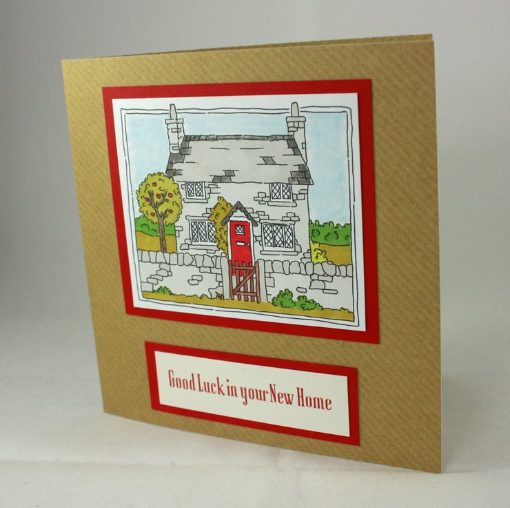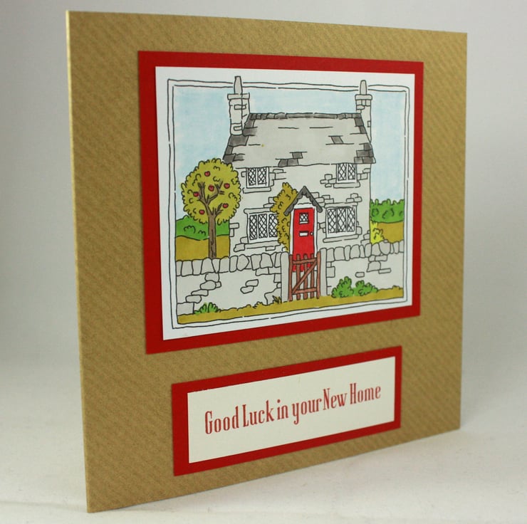 Square, kraft, new home card featuring a coloured image of a country cottage, with the message 'Good Luck in your new home'. Both the image and message have been mounted on red card. The insert has been left blank for your own personal message.
