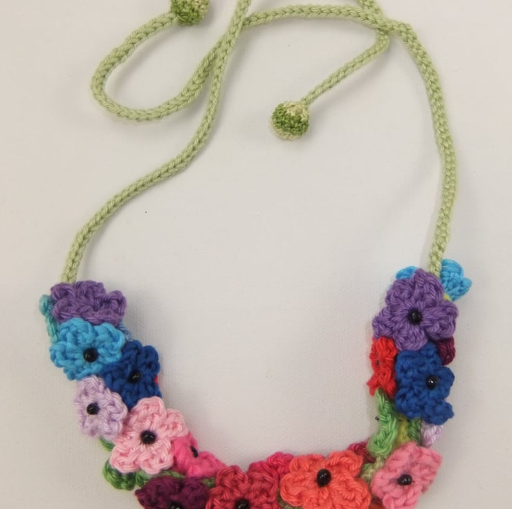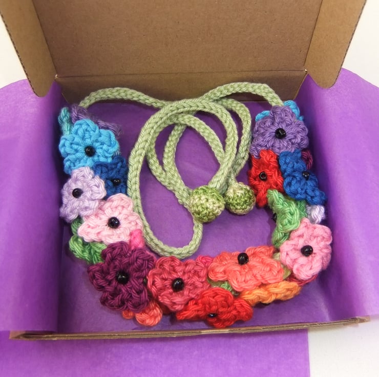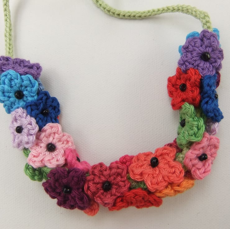 This colourful necklace is made up of 26 cotton flowers sewn onto cotton cords and finished with a tiny black glass sewn into the centre of each one. The main cord is finished at each end with a cotton ‘bead’ for easy tying. All the elements have been lovingly crocheted by me and the whole necklace measures approximately 73 cm from end to end and can be worn at different lengths. It could even be used as a headdress and is a perfect festival accessory!