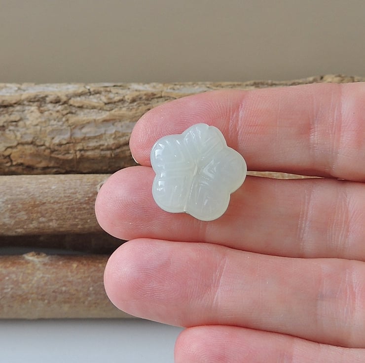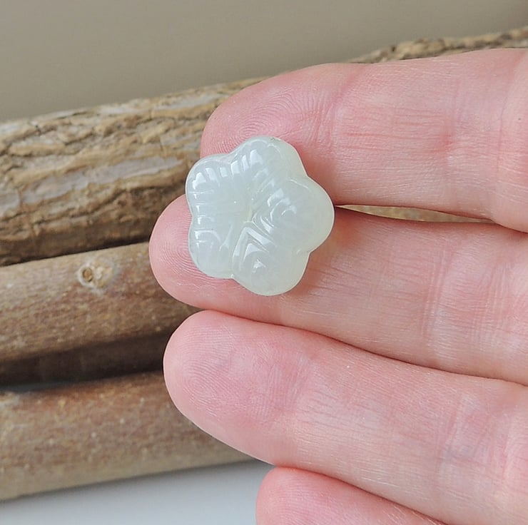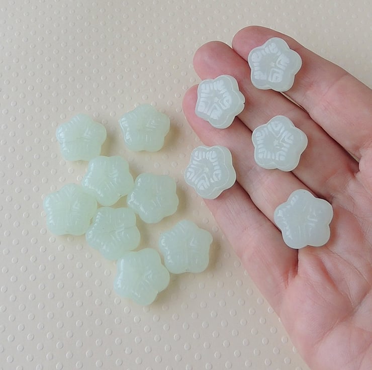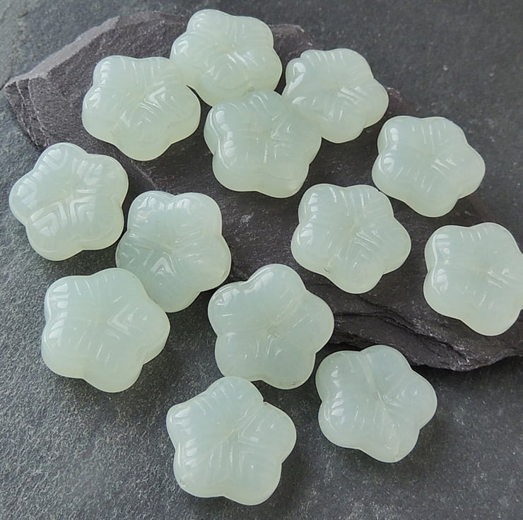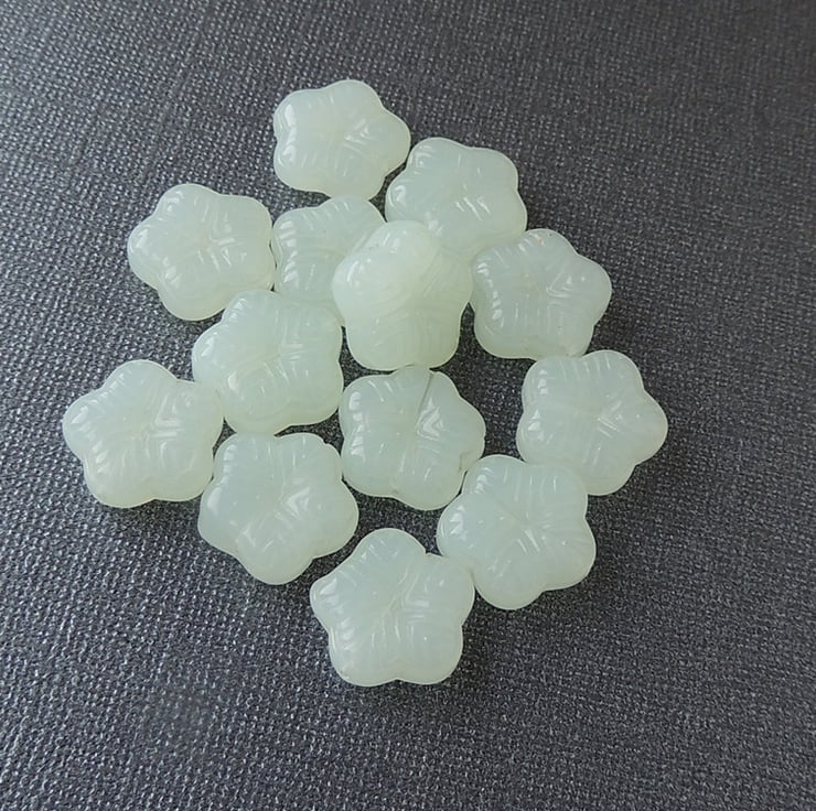 Pale green pressed glass beads. They have an attractive flower appearance.