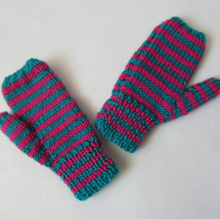 SALE Child's Hand Knitted Pink and Jade Green Striped Mittens % to Ukraine