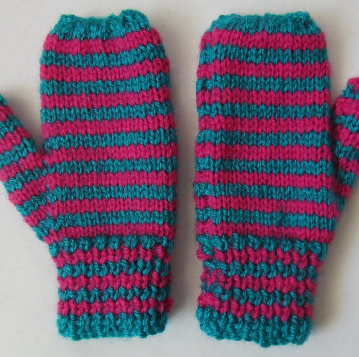 Pretty pink and jade green hand knitted mittens, suitable for a child aged about 2 to 3 years old. They measure 14.5 cm long and 6 cm (un-stretched) wide.