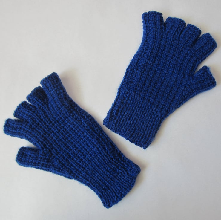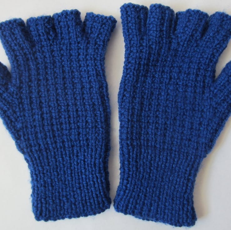 Hand knitted fingerless gloves suitable for medium ladies hands to small men's hands. They measures 22 cm long and 10 cm (un-stretched) wide.
