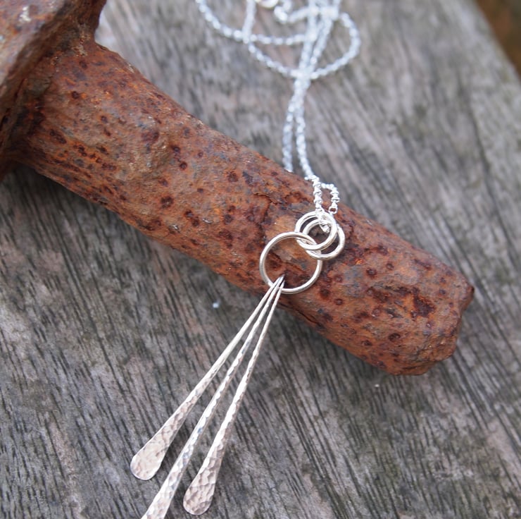 This sterling silver pendant has three hand forged rods of silver, of varying lengths, that have been hammered to add a texture and shine. They hang by a large ring and two small ones from a 41cm (16") sterling silver diamond cut belcher chain (other chain lengths are available, please contact me for details).