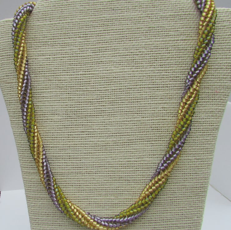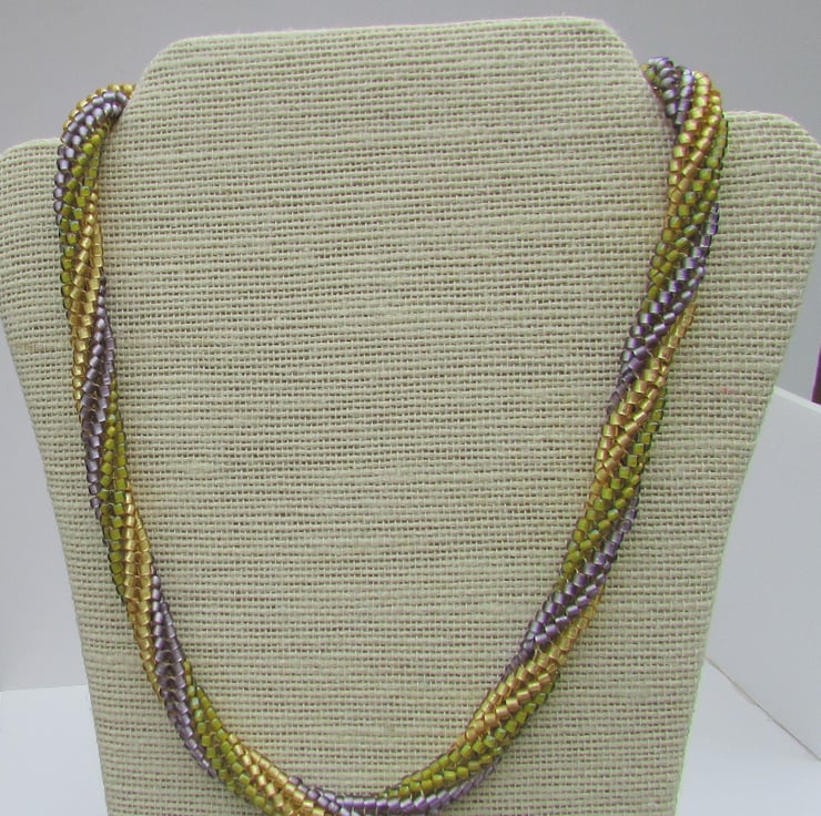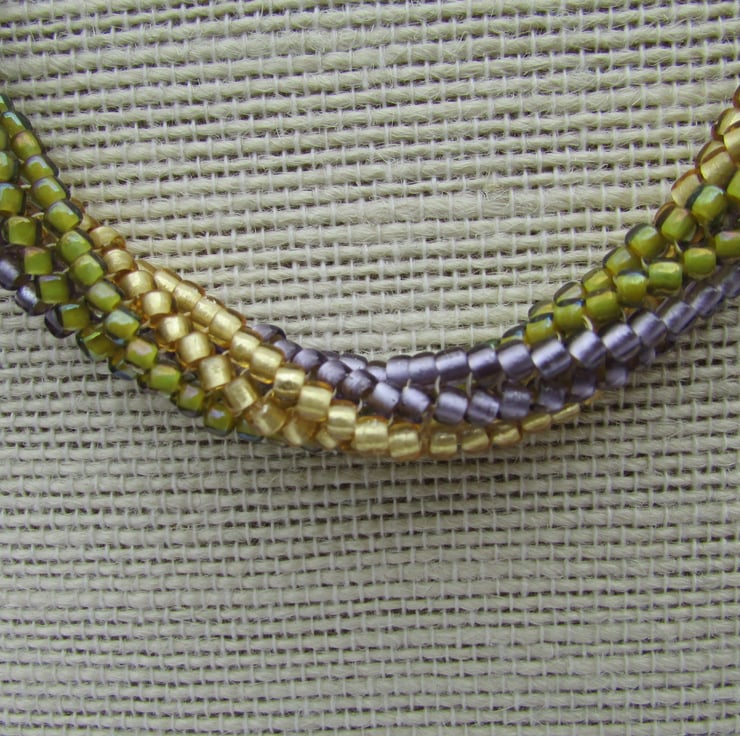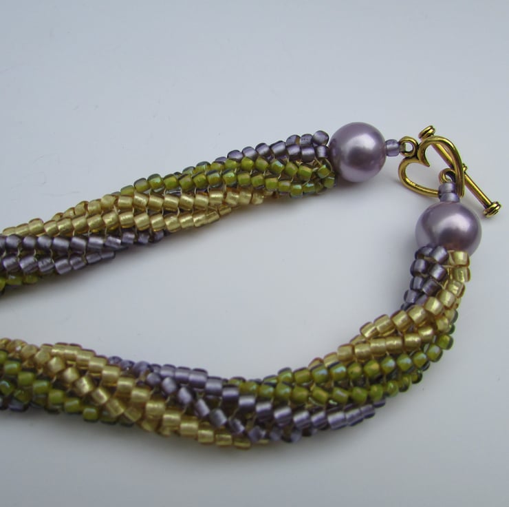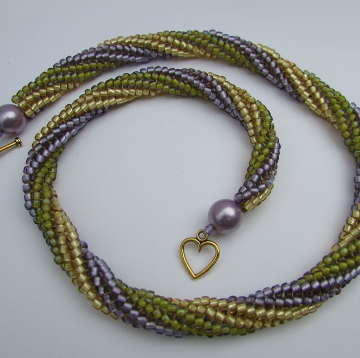 Beautiful lavender, olive and gold necklace made with size 8 seed beads in twisted herringbone stitch finished off with a lilac coloured glass pearl at either end with a gold colour heart shaped toggle clasp, the toggle clasp makes fastening easy.