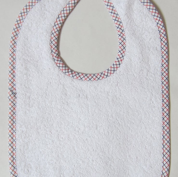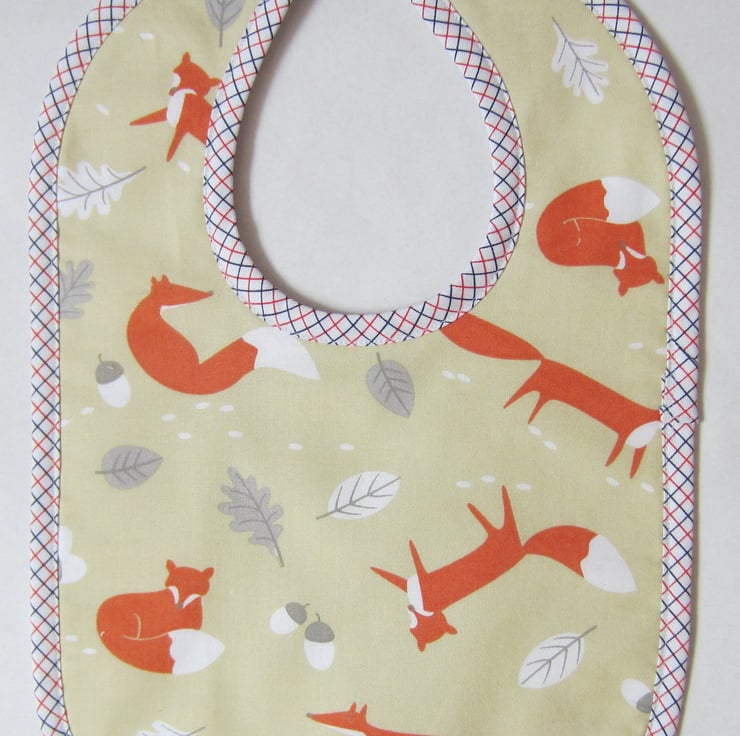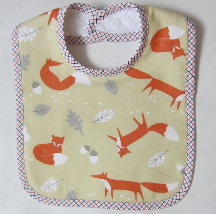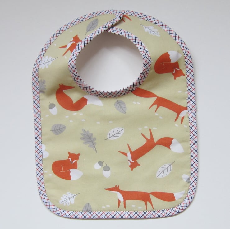 Large baby bib featuring rusty orange foxes on a cream background with leaves and acorns. Backed with white towelling and edged with an orange, black and white check bias binding.