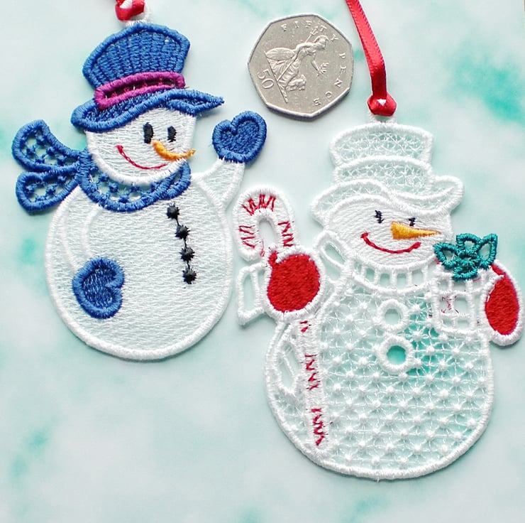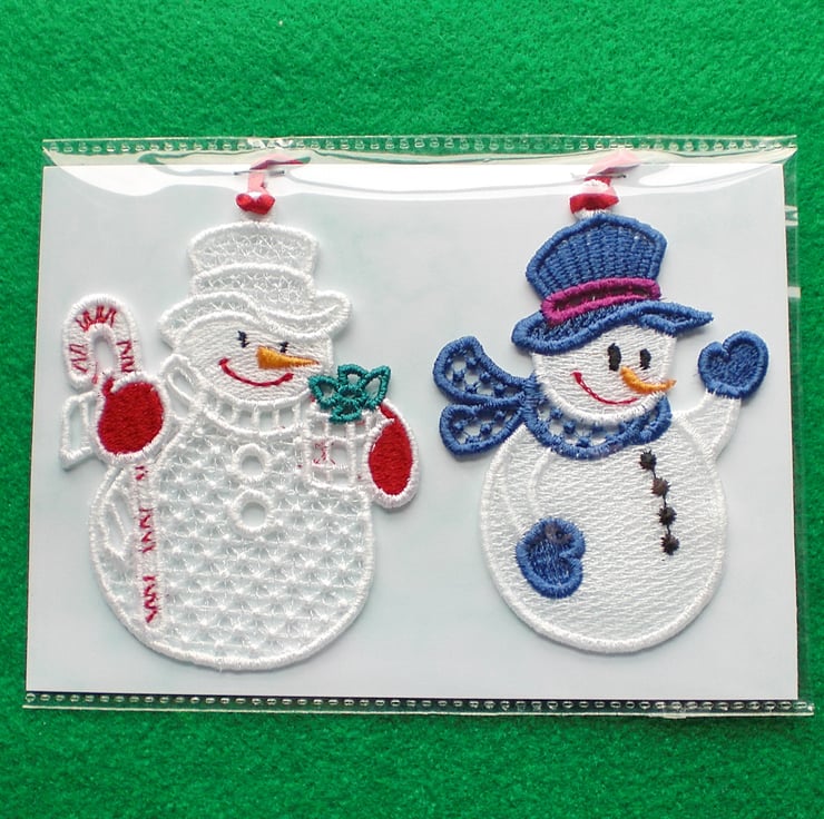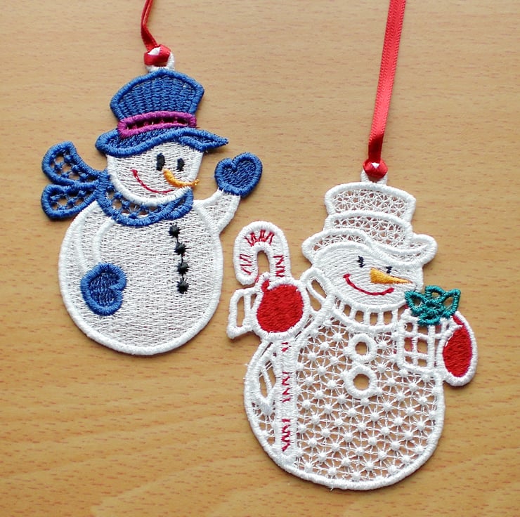 2 embroidered lace snowmen to hang on your tree, or anywhere in your home.