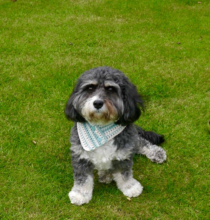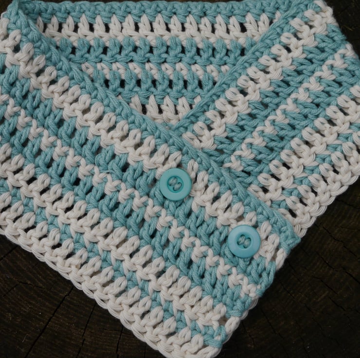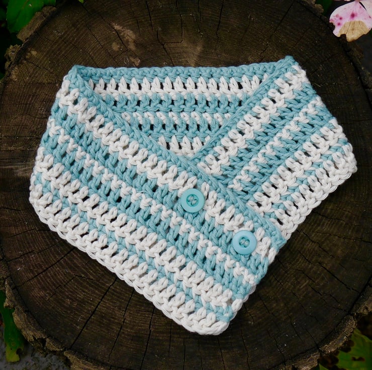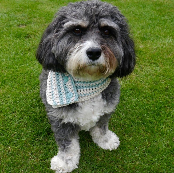 I have made this elegant crocheted dog scarf using lovely thick, warm yarn. It has two buttons sewn on. It is made in stripes of cream and duck egg blue cotton, making it easy to wash.