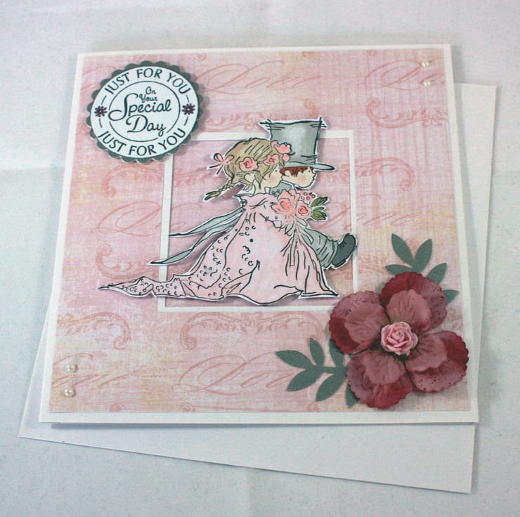Square, aperture card featuring a hand stamped and coloured image of a bride and groom, which has been cut out and attached to the card using silicone glue to give a 3D effect.