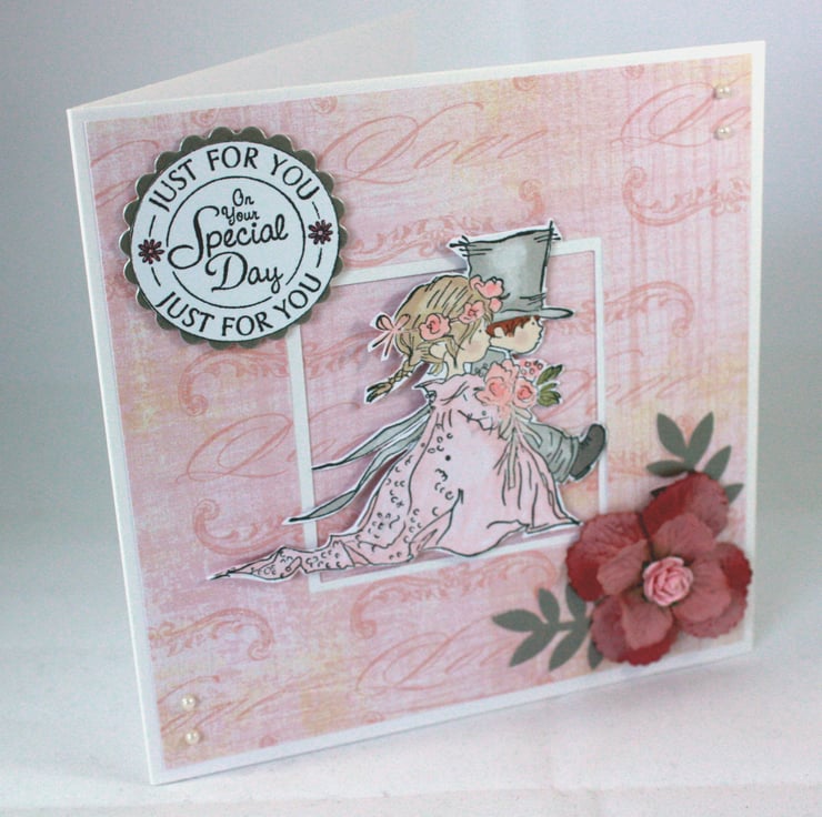 The centre of the aperture and the outer part of the card have the same patterned background paper. The message 'Just for you On your Special Day' has been stamped and layered over silver card. The card is finished with small faux pearls and pink paper flowers.