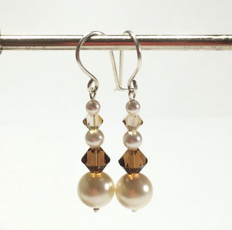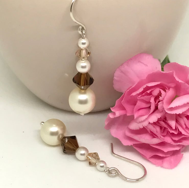 I have created these sterling silver earrings using beautiful crystals in dark topaz, golden shadow and cream glass pearl beads. I have handcrafted the hooks with sterling silver wire.