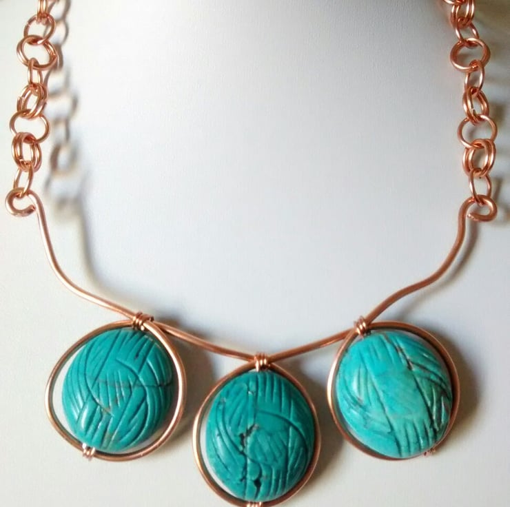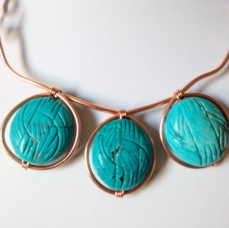 THE THREE CARVED MAGNESITE PEBBLES ARE 30X 28MM THEY ARE ENCASED WITH 2MM COPPER WIRE