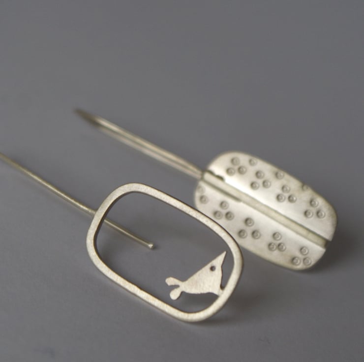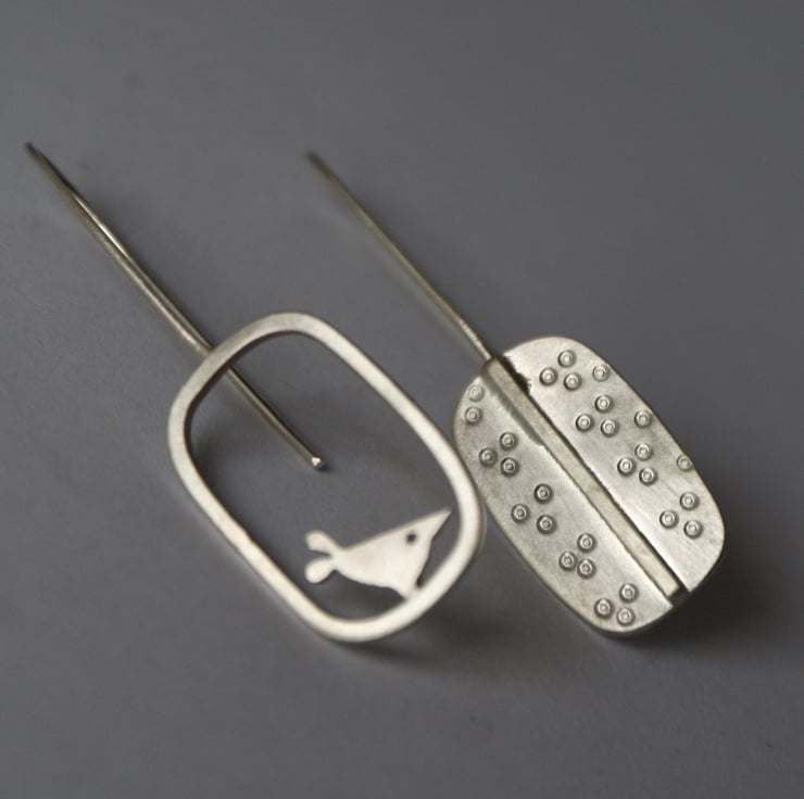 A cute pair of sterling silver drop earrings hand made by me. One earring is made from sterling silver square wire and a hand cut bird sits inside. The other is cut from silver sheet in a shape inspired by my two trees design and is finished with a circle pattern. The finish is a satin silver but can be polished to a shiny finish, just let me know when ordering. Please note each pair may vary very slightly from the image.