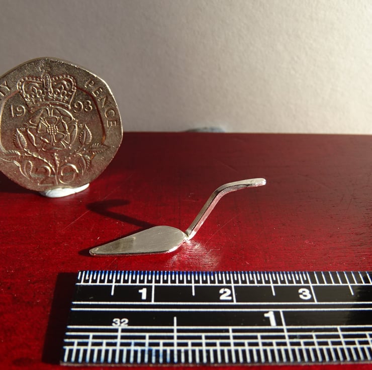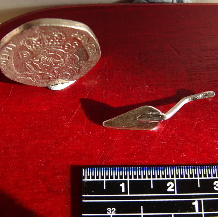 This handmade solid silver cake slice is made from 925 sterling silver sheet and has a high shine. It's length is approx 2.4cm. Ideal to go with any 12th scale tea-set or my cake stand for your dollshouse. It is too small to have a full hallmark. As each slice is individual it may vary from the photos shown.