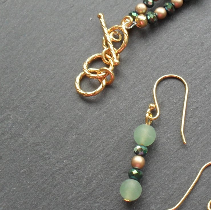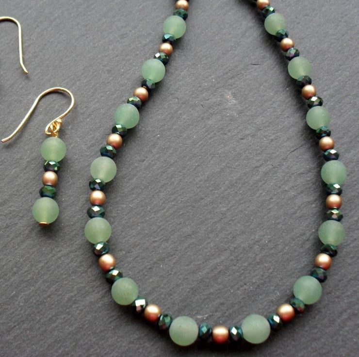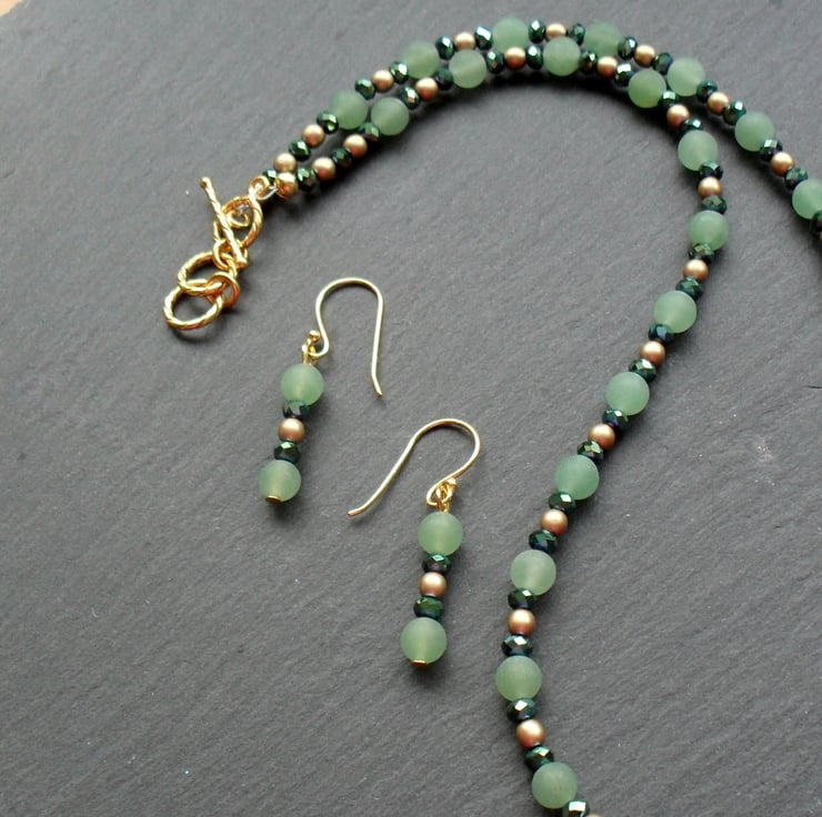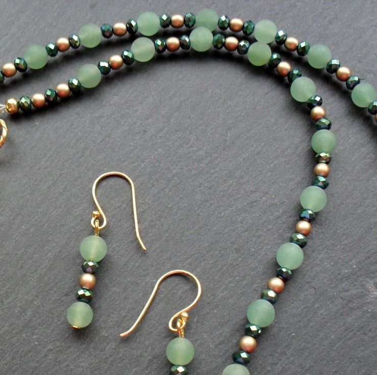 Frosted green aventurine gold Czech glass beads and crystals in a green colour with a hint of blue which add a little sparkle to the necklace.