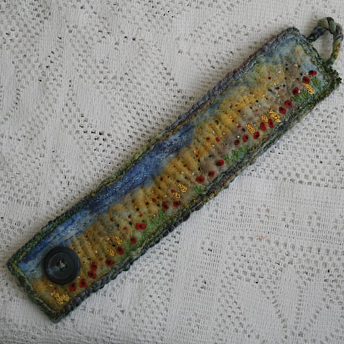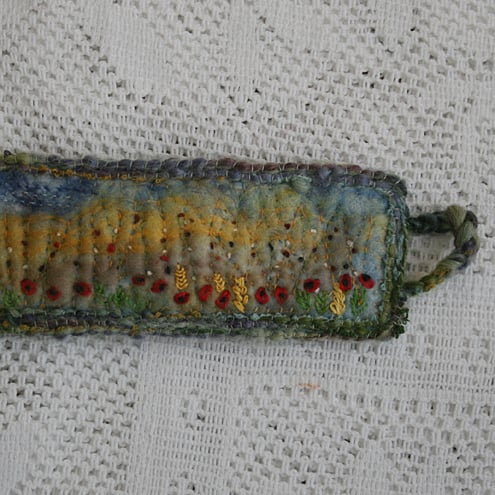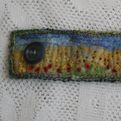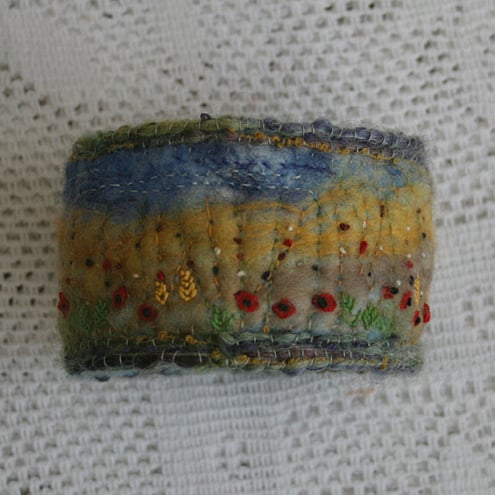 Poppies and ears of corn are scattered throughout the cornfield of the hand-felted background of this embroidered cuff.
